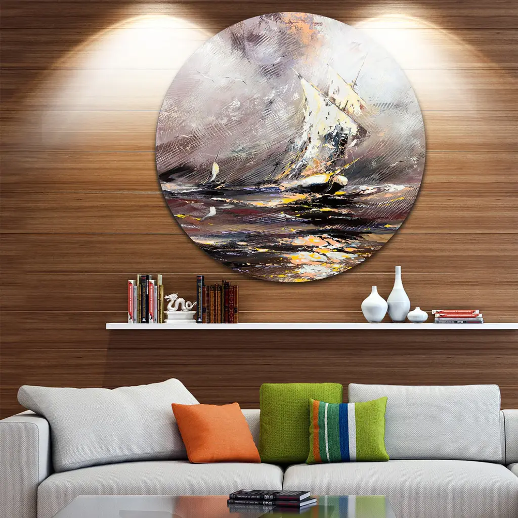 Vessel In Stormy Sea, Seascape Painting Large Disc Metal Wall Art, 36"