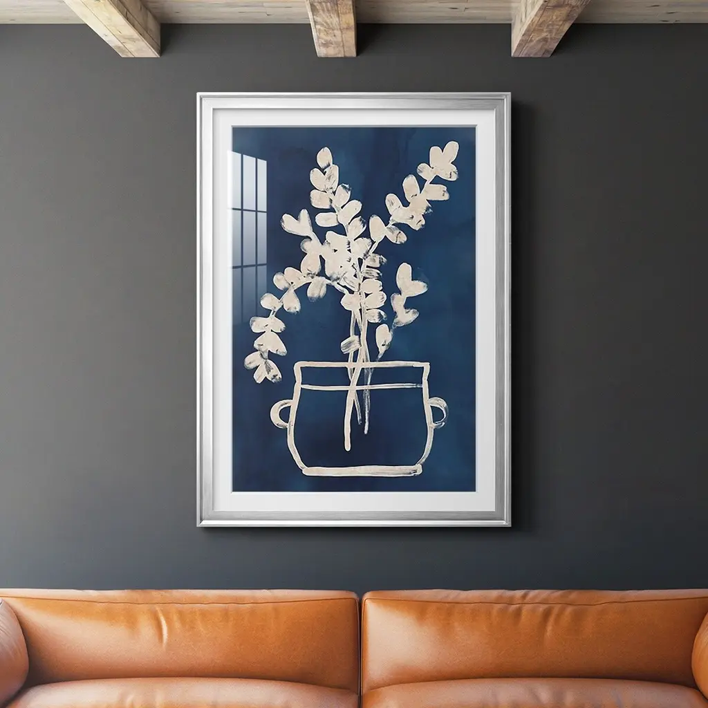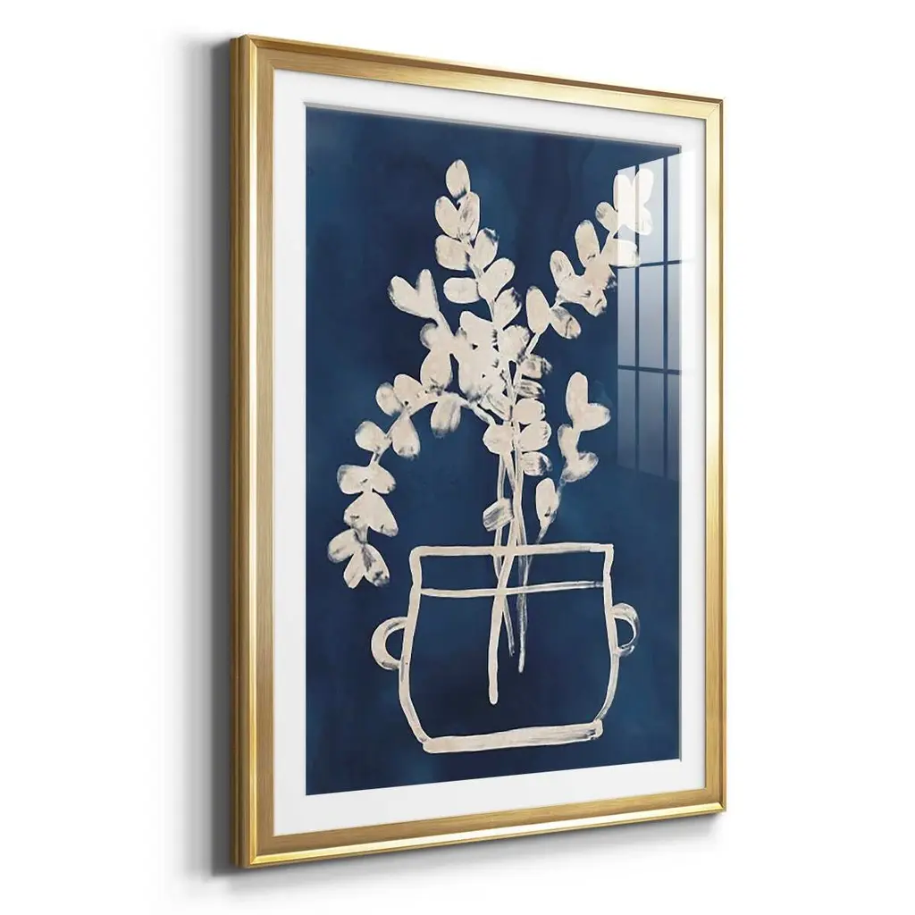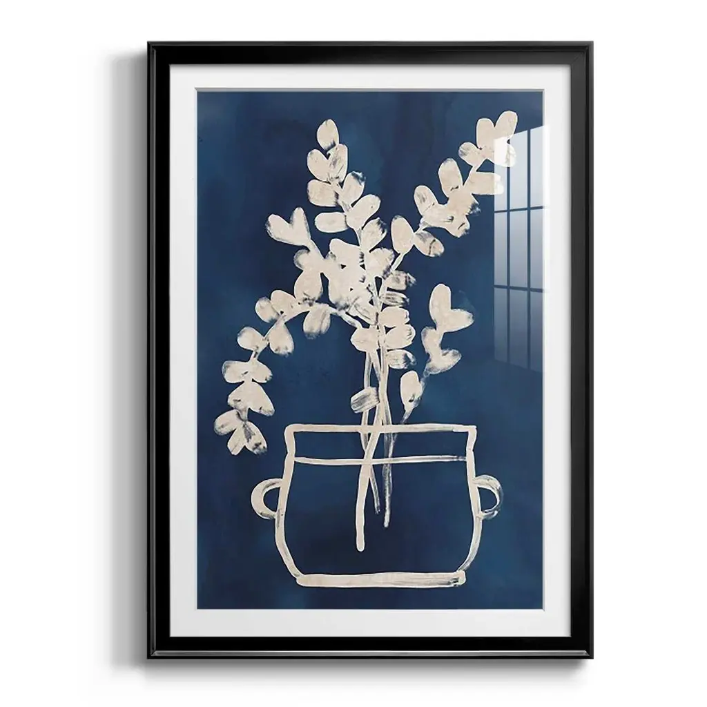 Vessel on Indigo I Premium Framed Print - Ready to Hang A Premium Framed Print created to last. Framed in distressed wood and available in an array of sizes and colors Featuring a beveled a solid wood stretcher bar, each piece comes ready to hand 4 SIZES AVAILABLE 30.5''X42.5'' - Overall Size 26.5'X36.5'' - Overall Size 22.5''x30.5'' - Overall Size 18.5''x24.5'' - Overall Size Each piece is made to order. Each piece comes with hanging hardware. Made in the USA Ready to Hang Giclee Paper Print Acrylic Glass Beveled Matt Board