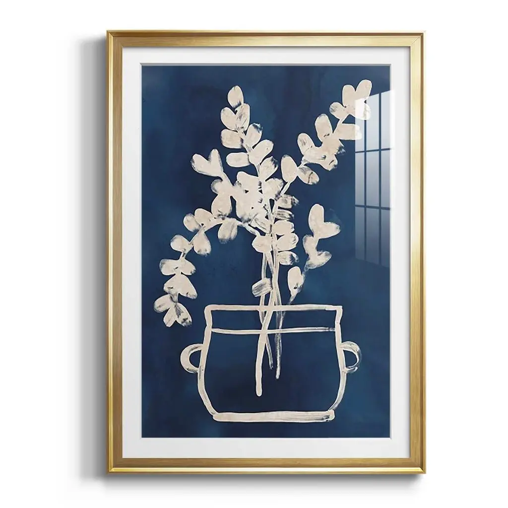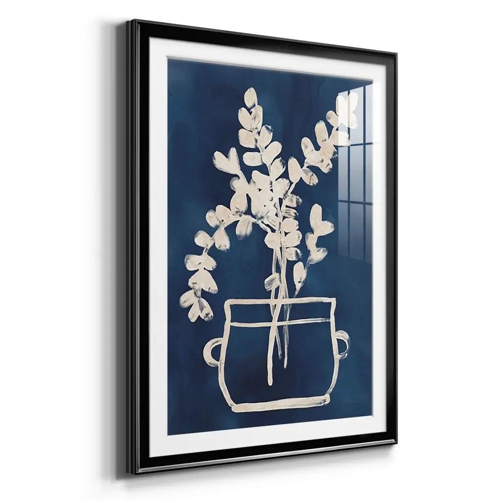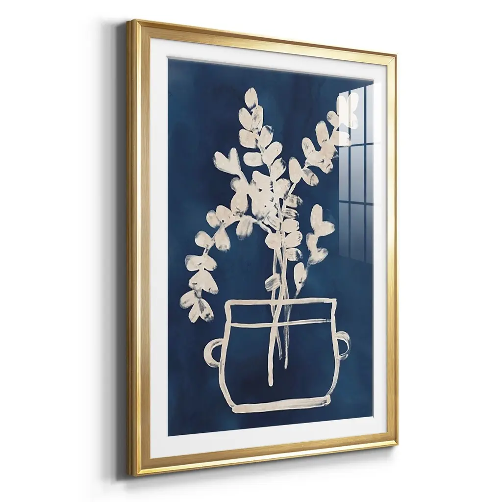 Vessel on Indigo I Premium Framed Print - Ready to Hang A Premium Framed Print created to last. Framed in distressed wood and available in an array of sizes and colors Featuring a beveled a solid wood stretcher bar, each piece comes ready to hand 4 SIZES AVAILABLE 30.5''X42.5'' - Overall Size 26.5'X36.5'' - Overall Size 22.5''x30.5'' - Overall Size 18.5''x24.5'' - Overall Size Each piece is made to order. Each piece comes with hanging hardware. Made in the USA Ready to Hang Giclee Paper Print Acrylic Glass Beveled Matt Board