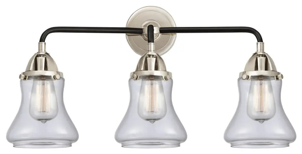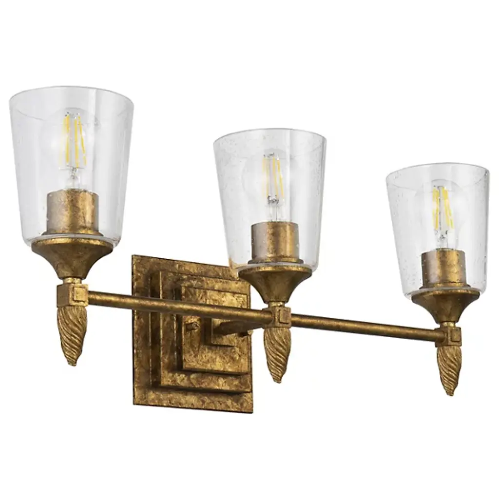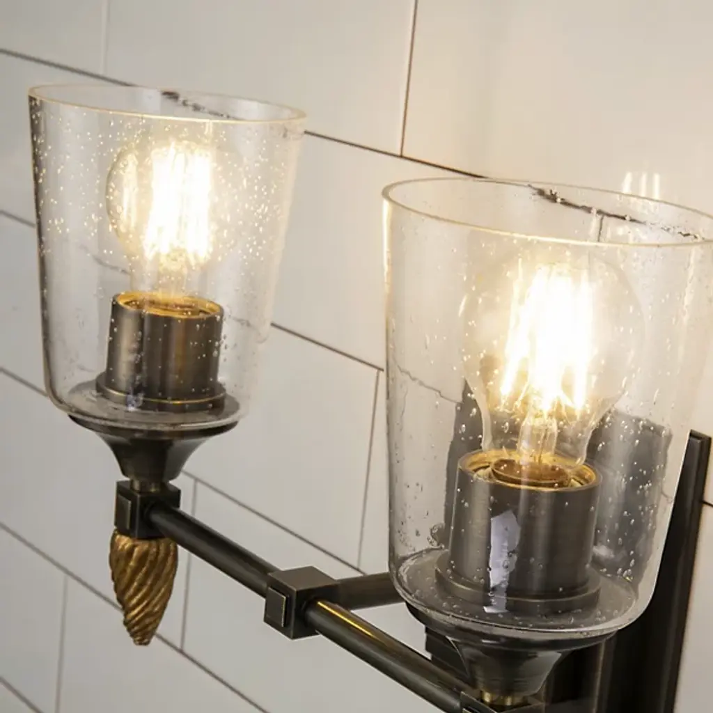 Lend a warm, vintage-style touch to inside walls with the inviting Vetiver Acorn Finial Vanity Light from Lucas McKearn. It’s a New Orleans-inspired piece, reminding one of classic Vetiver oil lamps. The nostalgic design comes forward with a stepped square mounting plate. Topping a slender crossbar, brilliant lamping rests inside flared shades of clear seeded glass. A textured, acorn-shaped finial descends from each socket below the crossbar, adding a touch of texture and memorable character to the smooth metal structure.