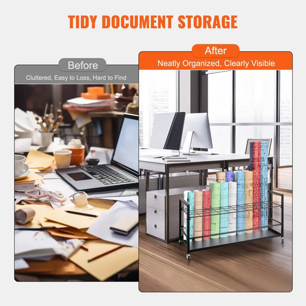 Feature: 50 Storage Slots: This blueprint storage rack features 50 slots of 3.5"x3.5"(90x90 mm) each, providing ample and organized storage space for your blueprints, construction plans, and various documents. Meet bulk file storage needs. The vertical roll storage maximizes space, ensuring easy access to needed documents. Premium Metal Construction: Our blueprint holder is build from thickened metal with a rust-proof powder coating for durability. The 5mm wire diameter enhances 66 lbs loading capacity, while smooth polished edges prevent hand injuries and document damage. Ensure safe and convenient storage! Convenient Mobility: This blueprint storage organizer has four swivel casters, two of which are lockable, allowing easy movement to your office, studio, or workplace. Documents remain secure and organized during transport, enhancing portability. Easy Assembly: We provide detailed installation instructions and necessary parts, requiring no additional tools and complicated steps. Set up the blueprint rack in just over 10 minutes. If you have any questions about the product, please feel free to contact us, and we will respond promptly. Versatile Applications: This blueprint roll file holder is perfect for architects, engineers, contractors, and designers for storing blueprints, architectural paper, engineering documents, maps, wrapping paper, and more. This reliable storage solution is essential for offices, schools, and various environments. Package Content 1 x Blueprint Storage Rack 4 x Universal Wheels (2 with Brakes) 4 x Screws M6x30 9 x Screws M6x30 9 x Nuts M6x30 1 x Wrench M8 1 x Wrench M6 1 x Hex Key M6