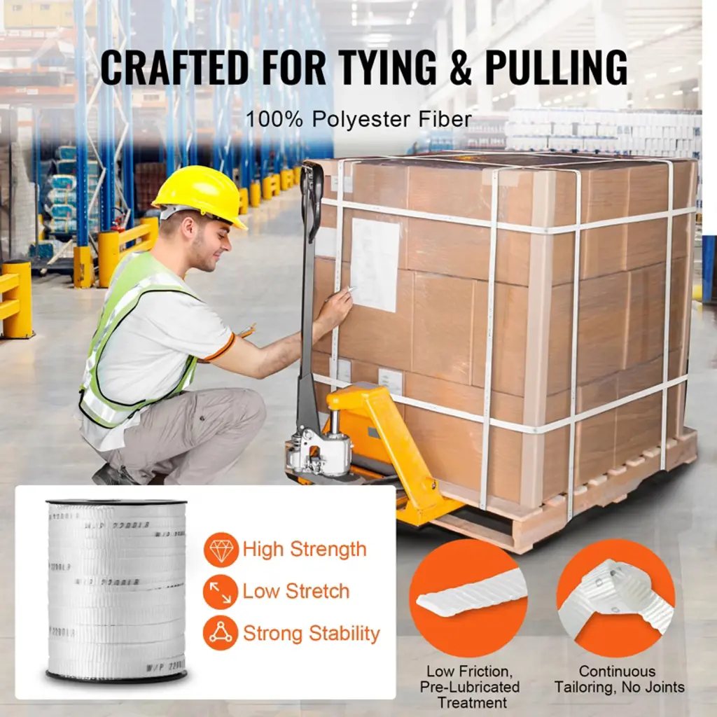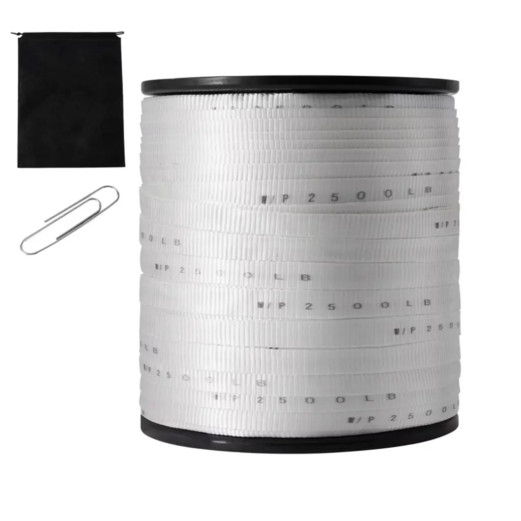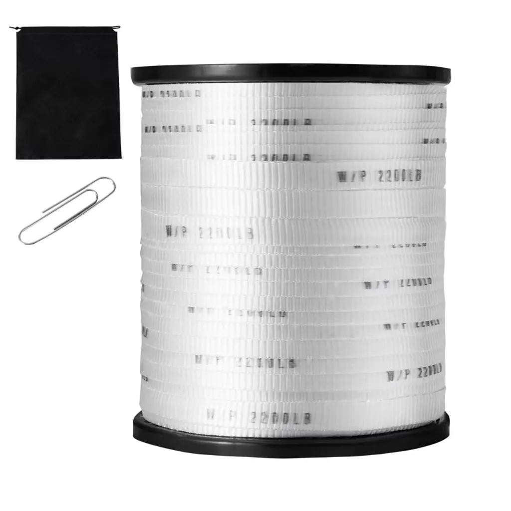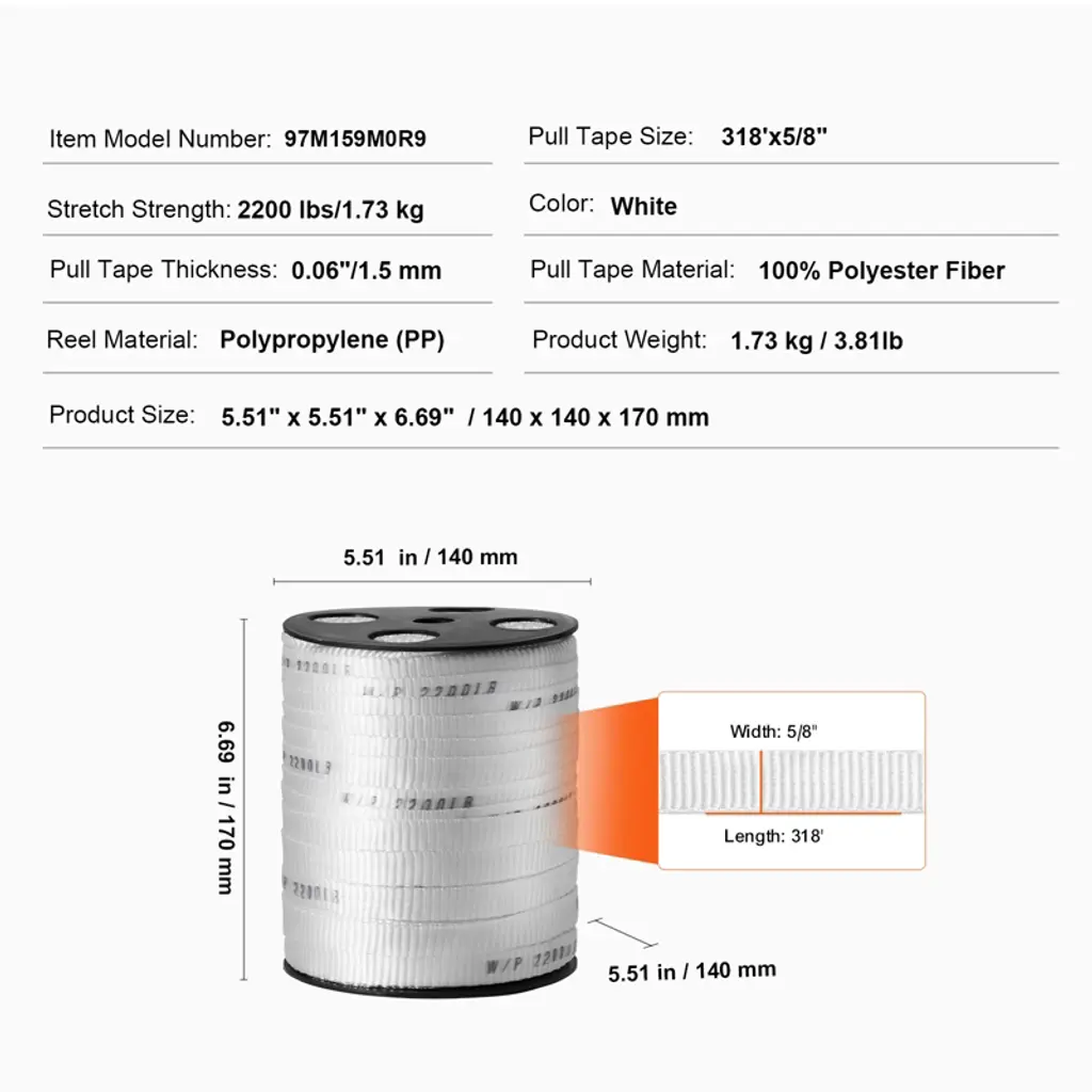 Feature: 2200 lbf Tensile Capacity: VEVOR polyester pull tape is made from high-quality 100% polyester material, giving you a whopping 2200 lbf of pulling power! It's perfect for tackling all sorts of tough jobs. Plus, it's labeled with clear strength markings (W/P 2200 LB) every inch for security and convenience. High-Performance Material: The pull tape is built tough with an industrial-grade polypropylene (PP) sleeve to keep it stable and strong even during high-speed pulls. And you won't have to worry about it losing shape over time. It's smooth and reliable, ready to meet all your wiring needs in a flash. 5% Extra-Long Spool: Get 5% more flat tape with our 318 ft length! It's pre-lubricated to reduce friction, making it a breeze to use. And with its high strength and low stretch properties, it can handle tight spaces and hard-to-reach electrical conduits like a champ. It's built to last, so you can count on it for the long haul. Convenient Accessories: We've included a handy non-woven storage bag and a large paperclip-style fastener to keep your flat rope organized and ready to go. It is easy to store and retrieve unused or used tapes, ensuring neatness and convenience during use. Versatile Applications: Our polyester webbing isn't just for home DIY and professional wiring – it's a multitasking marvel! Use it for packaging, shipping, gear tightening, pulling goods, even hanging hammocks! With so many uses, it's sure to become your go-to tool for all kinds of projects. Package Content: 1 x Polyester Pull Tape 1 x Large Paper Clip 1 x Non-Woven Storage Bag