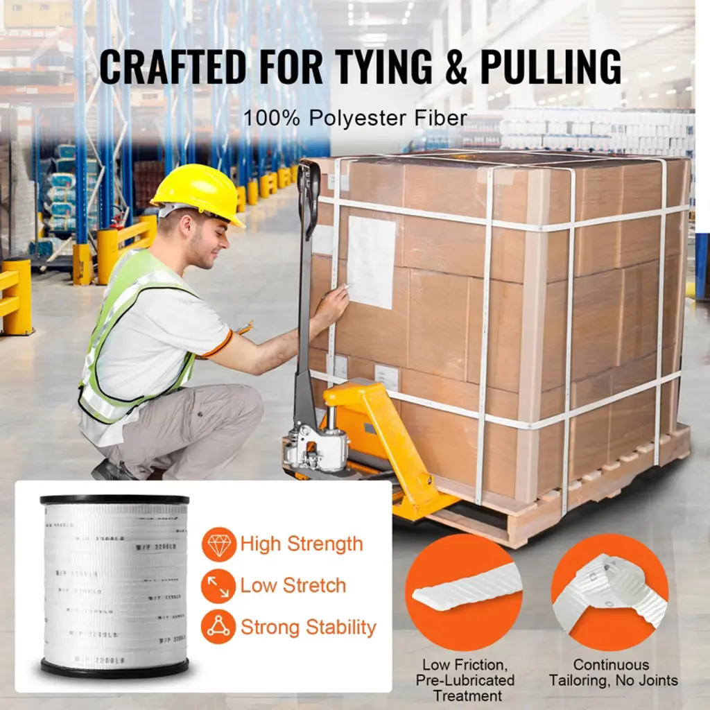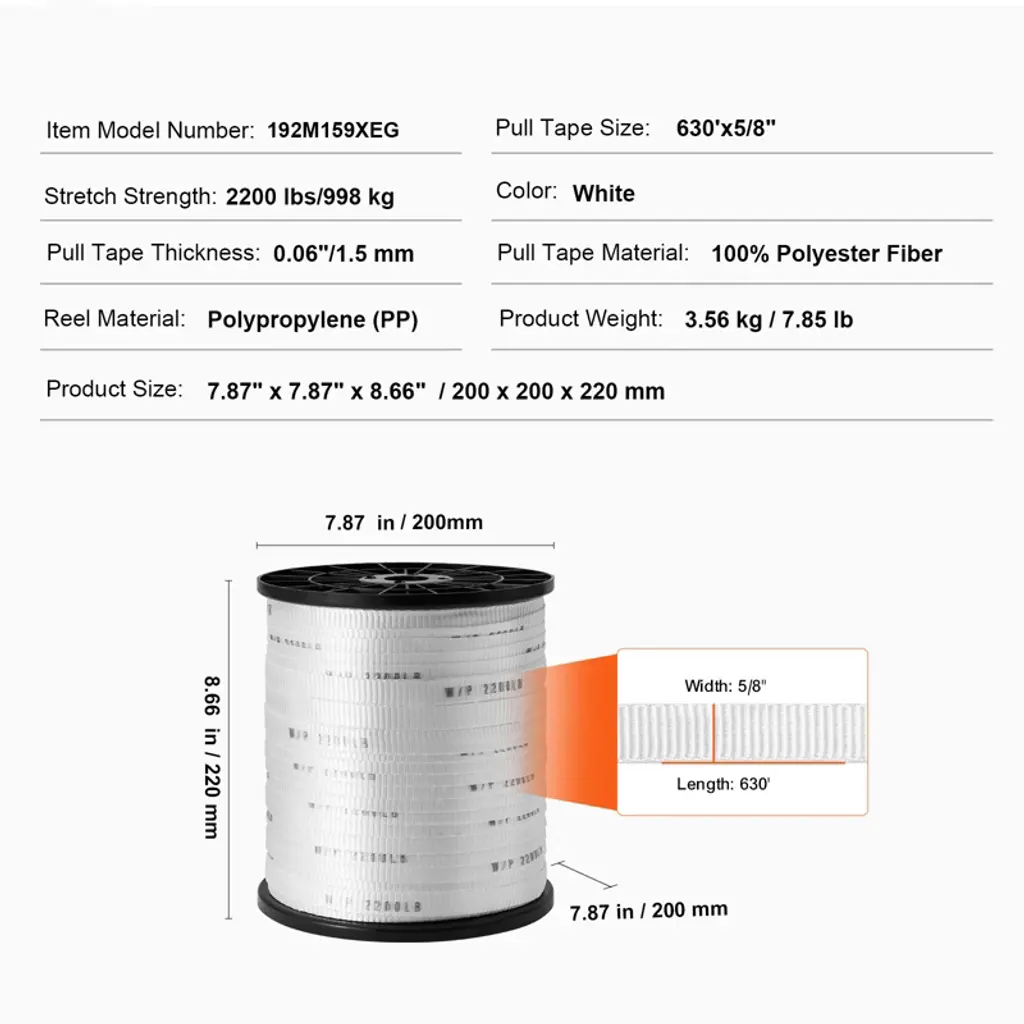 Feature: 2200 lbf Tensile Capacity: VEVOR polyester pull tape is made from high-quality 100% polyester material, giving you a whopping 2200 lbf of pulling power! It's perfect for tackling all sorts of tough jobs. Plus, it's labeled with clear strength markings (W/P 2200 LB) every inch for security and convenience. High-Performance Material: The pull tape is built tough with an industrial-grade polypropylene (PP) sleeve to keep it stable and strong even during high-speed pulls. And you won't have to worry about it losing shape over time. It's smooth and reliable, ready to meet all your wiring needs in a flash. 5% Extra-Long Spool: Get 5% more flat tape with our 630 ft length! It's pre-lubricated to reduce friction, making it a breeze to use. And with its high strength and low stretch properties, it can handle tight spaces and hard-to-reach electrical conduits like a champ. It's built to last, so you can count on it for the long haul. Convenient Accessories: We've included a handy non-woven storage bag and a large paperclip-style fastener to keep your flat rope organized and ready to go. It is easy to store and retrieve unused or used tapes, ensuring neatness and convenience during use. Versatile Applications: Our polyester webbing isn't just for home DIY and professional wiring – it's a multitasking marvel! Use it for packaging, shipping, gear tightening, pulling goods, even hanging hammocks! With so many uses, it's sure to become your go-to tool for all kinds of projects. Package Content: 1 x Polyester Pull Tape 1 x Large Paper Clip 1 x Non-Woven Storage Bag