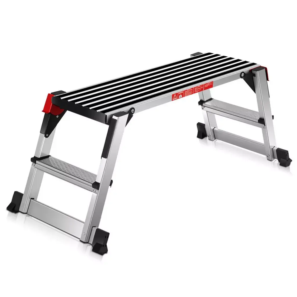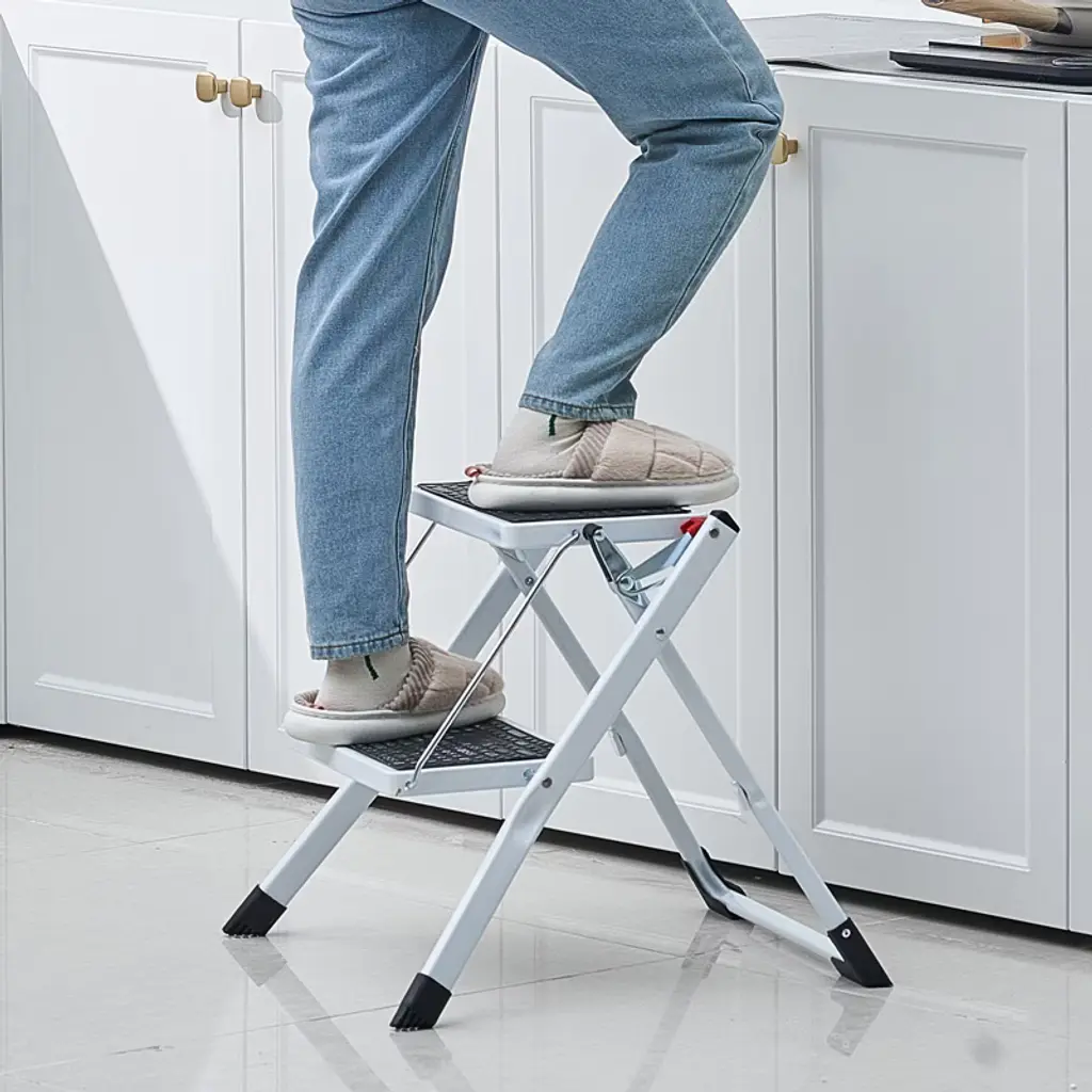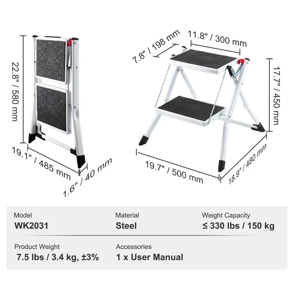 Feature: Foldable Two-Step Step Stool: Our two-step step stool is designed for quick and easy folding. Equipped with a convenient lock, simply press the red lock to fold it down swiftly, making it easy to open for use and store when not in use. The dimensions of this two-step step stool when opened are 19.7" L x 18.9" W x 17.7" H, with a step height of 17.5" / 445 mm, perfect for everyday household needs. Robust Load-Bearing Capacity without Collapsing: This step stool is constructed with high-quality Q235B carbon steel and a stable structure, ensuring toughness and stability. It can bear a load of up to 330 lbs / 150 kg (tested up to 1000 lbs / 453.6 kg without damage) and is certified to meet the European EN14183 standard. Whether used for stepping or sitting, it won't collapse or tip over, making it much more durable than typical plastic or iron footstools. Compact and Space-Saving: When folded, our step stool measures just 19.1" x 1.6" x 22.8" / 485 x 40 x 580 mm, allowing you to easily stow it in a closet or corner of your home without taking up much space. With a lightweight design and a portable handle, it's convenient and easy to carry, weighing only 7.5 lbs / 3.4 kg. Safe and Non-Slip: The step stool's platform features a full-coverage anti-slip layer to prevent slipping, and its edges are smooth to avoid injuring your hands. Thick rubber foot covers on all four stool legs increase friction, ensuring safe use even on smooth tile floors. Every detail is designed with your safety in mind. Versatile Uses: The two-step step stool is suitable for tasks like changing light bulbs, reaching books or bottles on high shelves, or cleaning vehicles. It can also serve as a comfortable seat with a convenient height. It's useful for painting, cleaning, picking, and decorating your home, and it can be employed in various settings such as kitchens, offices, garages, gardens, and shops. Package Content: 1 x Step Stool 1 x User Manual