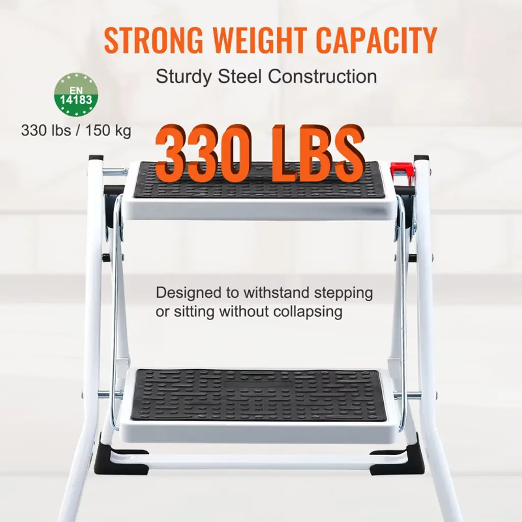 Vevor Step Ladder 2-step 330lbs Capacity, Ergonomic Folding Steel Step Stool With Wide Anti-slip Pedal, Step Stool For Adults Toddlers,white+black