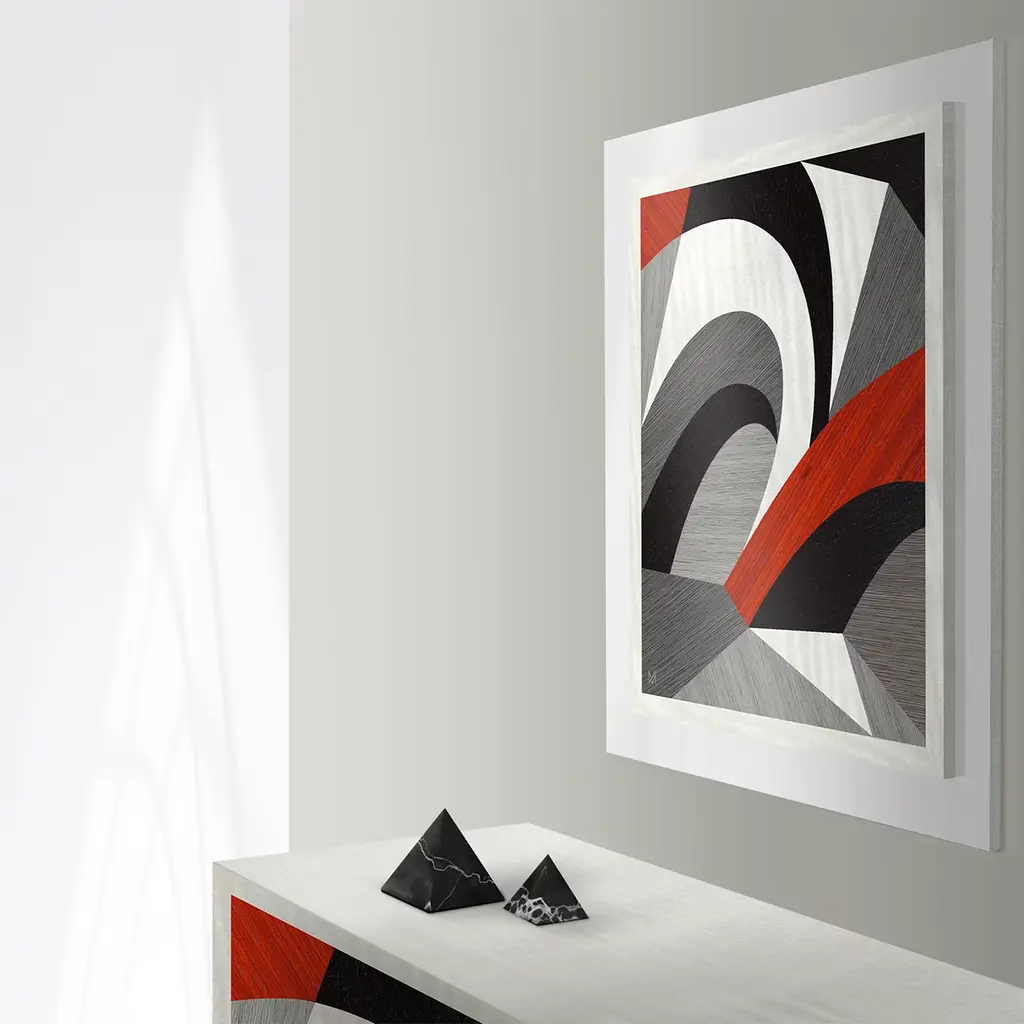 The arches of "Via Roma" are the trademark of Turin. Marzia Boaglio deconstructs them, creating a new geometry of harmonious lines defined by precious wood inlays. A combination of Tanganika Frisè wood, Light Gray Jata, Dark Gray Tay, Black Lati, and Red Ash reveals the three-dimensional flow of shapes. The blend of wood essences imparts an abstract pattern to this elegant and modern wooden panel. 'Via Roma' is available with a glossy or matte finish, please contact the Concierge for details.