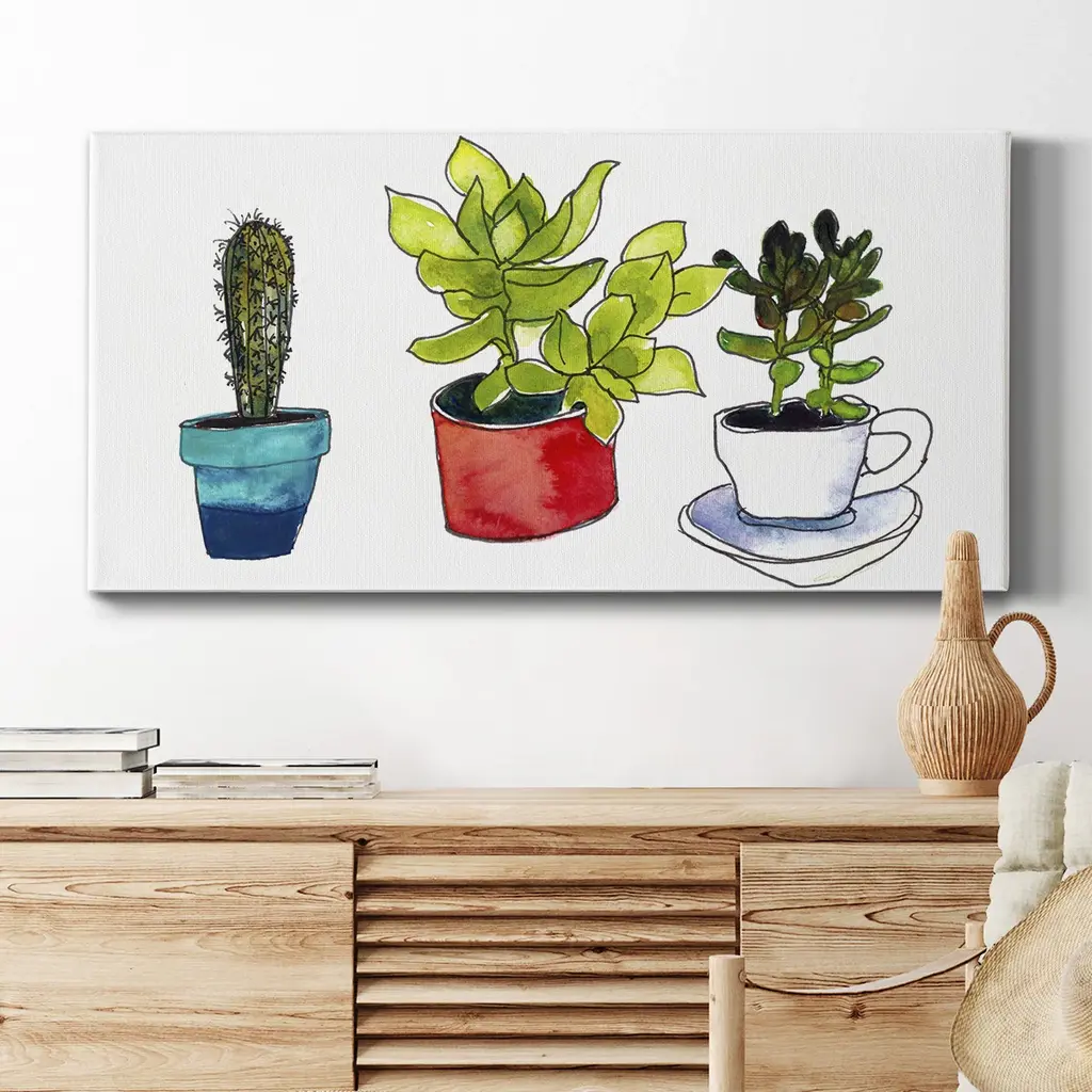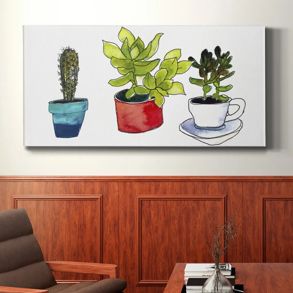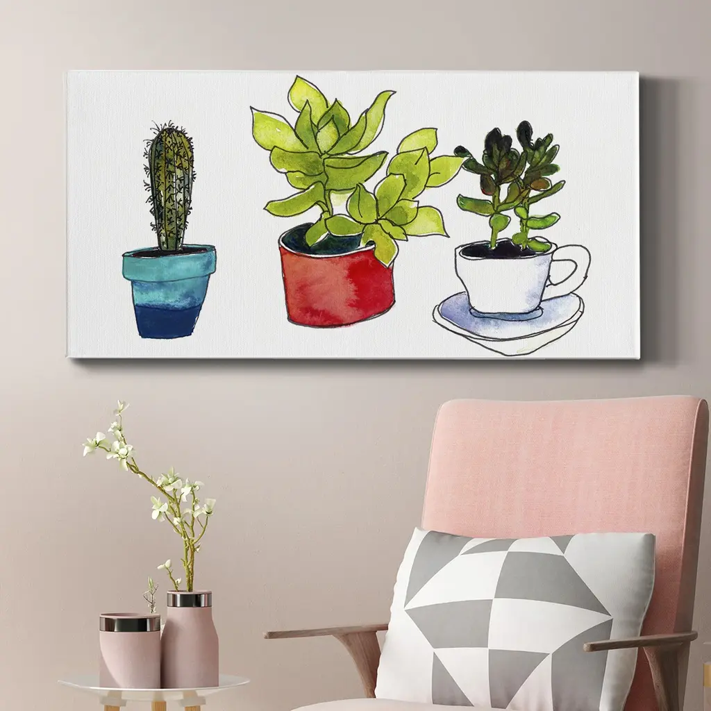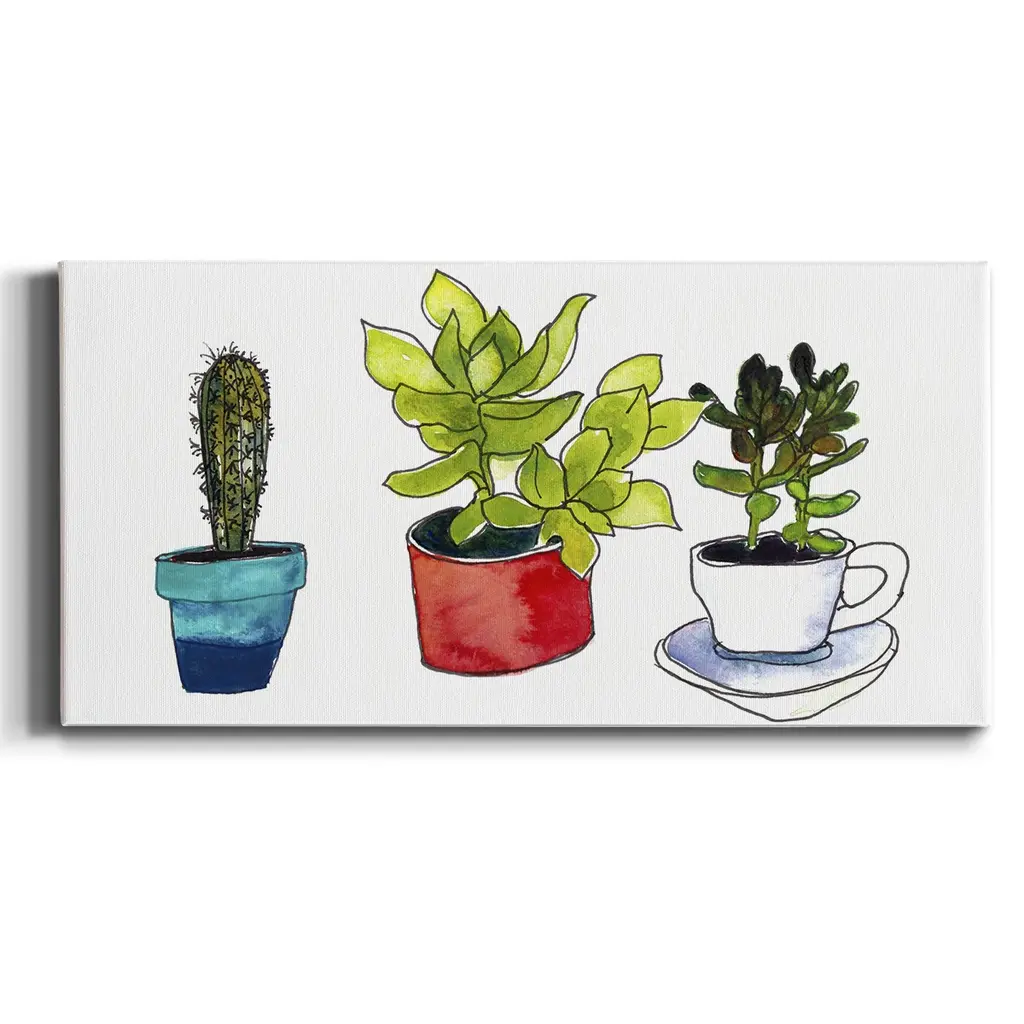 Vibing Succulents II- Premium Gallery Wrapped Canvas - Ready to Hang A premium hand stretched gallery wrapped canvas print created to last. Featuring a beveled a solid wood stretcher bar, each piece comes ready to hand 3 SIZES AVAILABLE 8''X16'' - Overall Size 12"X24'' - Overall Size 20''x40'' - Overall Size Each piece is made to order. Built to Last Each piece comes ready to hang Solid wood stretcher Fade and Water resistant Made domestically
