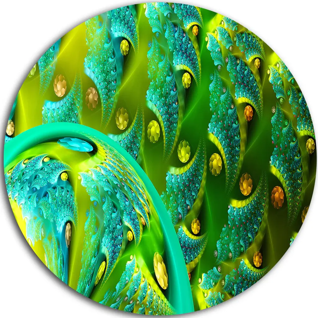 Bring Contemporary Abstraction to your home with this large Circle Metal wall art. This Vibrant Green Fractal Flower Design Metal Artwork makes it the focal point of any room or office. - White Gloss Coating ensures colors are extra vibrant with light reflection.- Aluminum grade Sheet Metal with 1 inch mounting frame on the back giving the illusion that the artwork is floating on the wall..- Mounting Brackets are included along with instructions.- High Quality Digital images are created directly into a glossy aluminum panel producing a stunning and captivating print into the glossy finish of the metal.- Water, Fire and Scratch resistant HD Aluminum panels.- Looks better than any photo paper and guaranteed to last at least 20 years- Easy to clean with a microfiber cloth. Colors are far superior to regular Canvas Art. - Easy to Hang