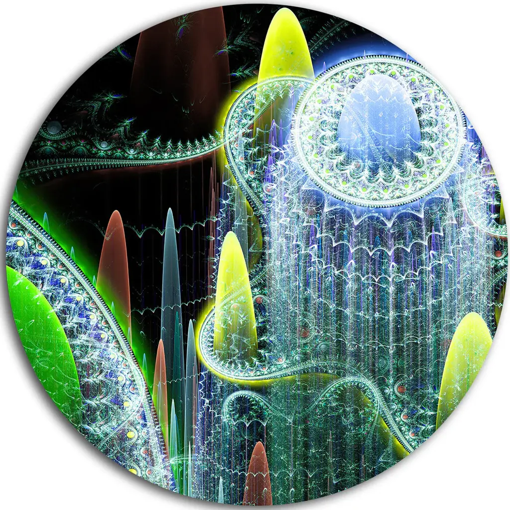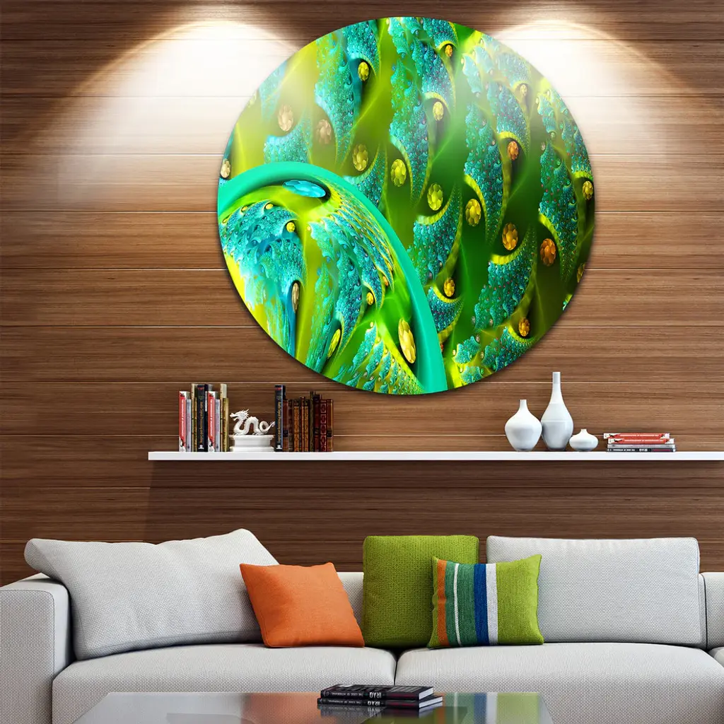 Bring Contemporary Abstraction to your home with this large Circle Metal wall art. This Vibrant Green Fractal Flower Pattern Metal Artwork makes it the focal point of any room or office. - White Gloss Coating ensures colors are extra vibrant with light reflection.- Aluminum grade Sheet Metal with 1 inch mounting frame on the back giving the illusion that the artwork is floating on the wall..- Mounting Brackets are included along with instructions.- High Quality Digital images are created directly into a glossy aluminum panel producing a stunning and captivating print into the glossy finish of the metal.- Water, Fire and Scratch resistant HD Aluminum panels.- Looks better than any photo paper and guaranteed to last at least 20 years- Easy to clean with a microfiber cloth. Colors are far superior to regular Canvas Art. - Easy to Hang