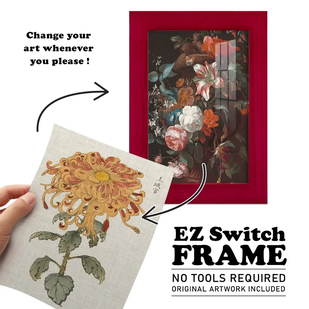 Vibrant Mums I -EZ SWITCH Framed Print w/glass-Cherry Red A delightful, framed print. Featuring a solid wood frame with real wood glass. This premium print is giclee quality. In addition, every frame features a removable back and table top stand. This allows you to change your art in the future or to just stand the art on a table for a new look. We are sure you'll enjoy our new series of EZ SWITCH Framed Art. Solid Wood Frame Real Glass Removable / Replaceable Art Built in Tabletop Stand Sizes range from 4x6 up to 12x15 - buy just one or pair them up as sets as you see fit.