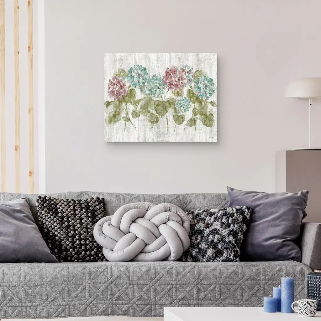 Vibrant Row of Hydrangea on Wood by Cheri Blum Canvas Art Print is produced with printing that covers the entirety of the canvas for a sleek and stylish museum-quality look. Our framed prints are made by expert craftsmen who strive to make each canvas the masterpiece