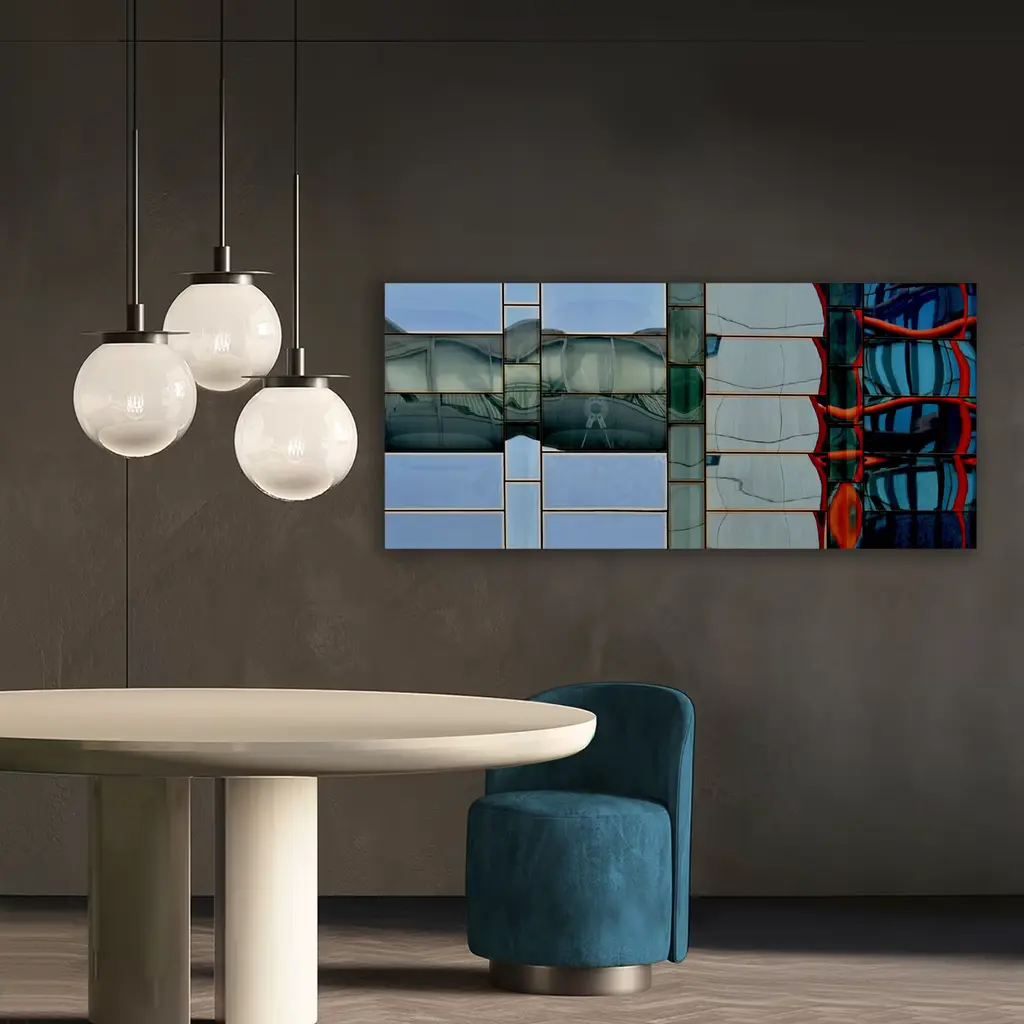 Fine Art Photography, Limited Edition of 3 copies, copy 2 of 3. Print on Plexiglass with dibond bottom. In the "Vibrations series", the artist researches abstract and surrealistic shapes produced by the windows of urban skyscrapers. As a result of a complex process of photographic choices and editing, the artist creates works of art in between photography and painting that are inspired by Surrealism and Futurism. Delivered with a certificate of authenticity, can be customized in format.