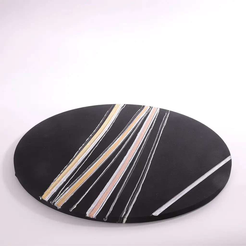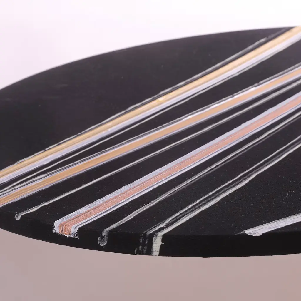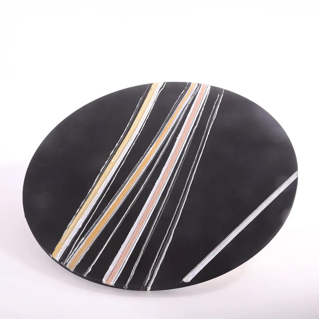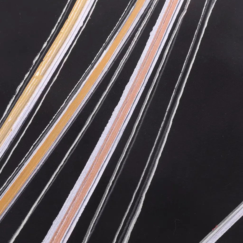 The Vibrations Lumen Planet painting encapsulates the essence of organic expression through its abstract representation. This artwork transcends conventional geometric lines, instead embracing the fluidity of sight and the horizon. It showcases a sophisticated interplay of movement and dynamic lines, embodying a purifying gesture that transforms informal strokes into a generative form. The piece invites viewers to explore the boundaries of space and time through its expansive visual narrative, enriching any modern art collection. This striking black painting serves as a bold statement, enhancing the aesthetic of contemporary interiors. Its unique interpretation fosters an atmosphere of openness, making it a perfect focal point. One-of-a-kind piece.