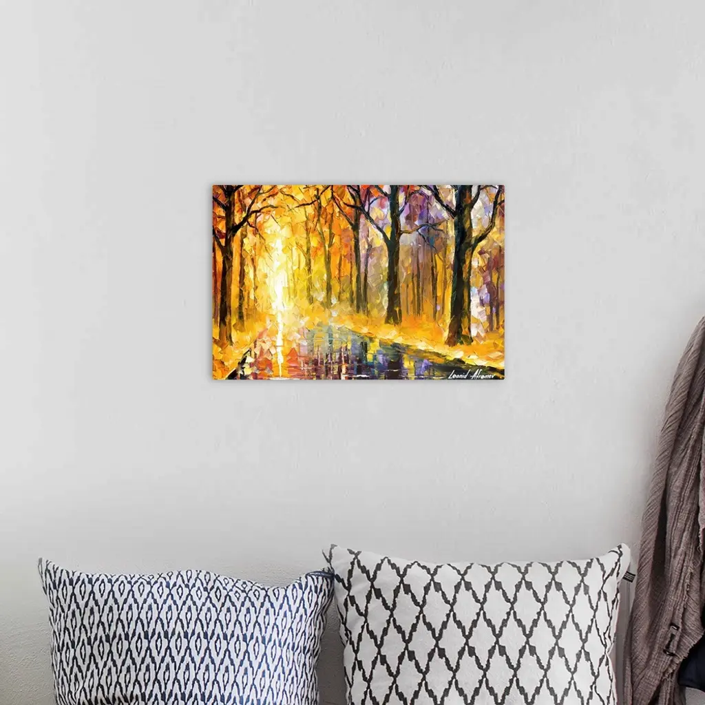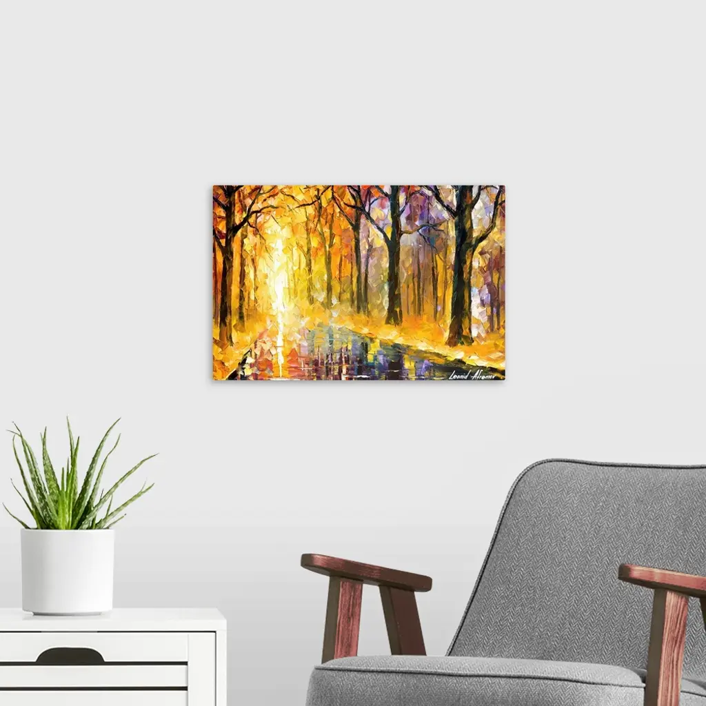 Contemporary painting of a tree line road wet and reflective after an autumn rain.