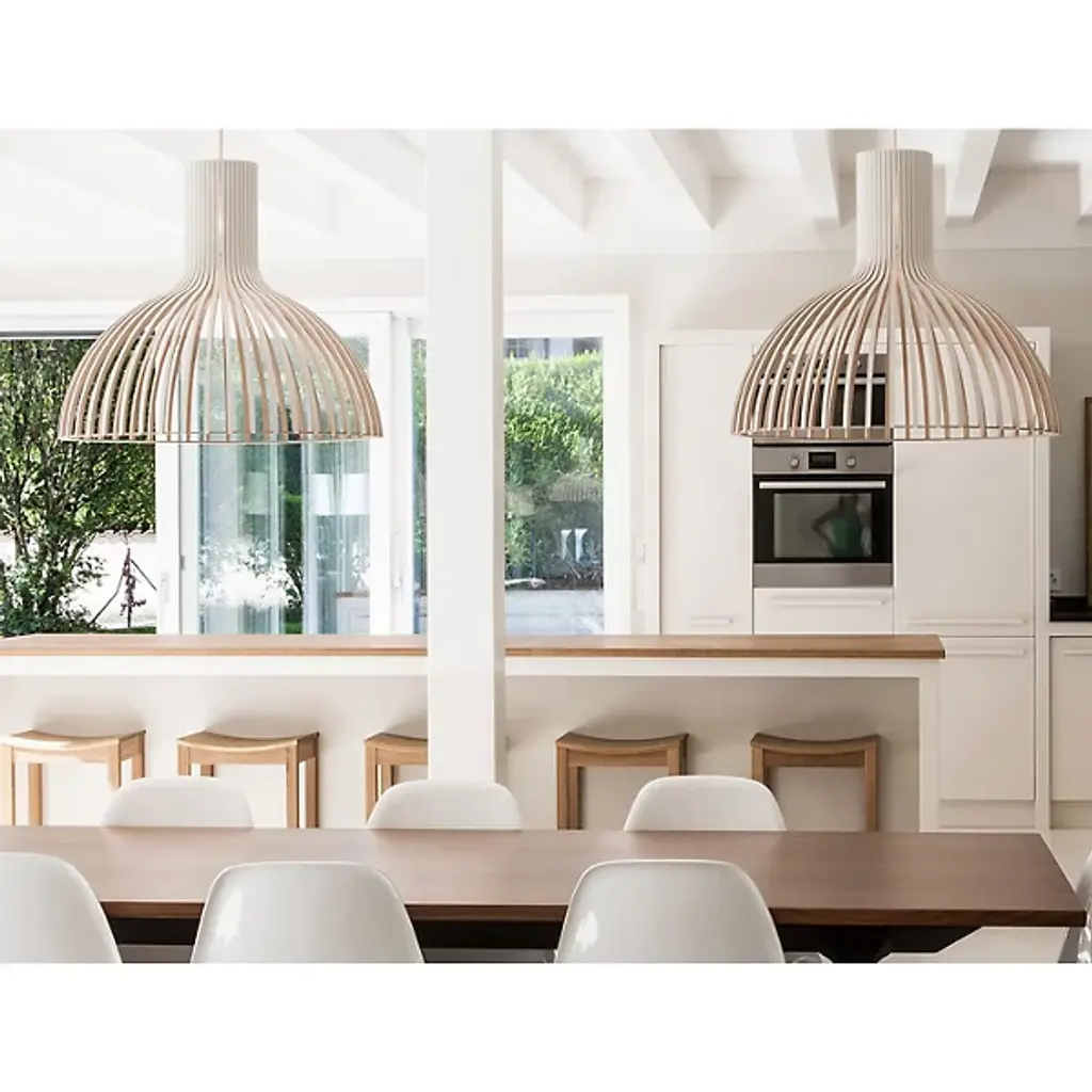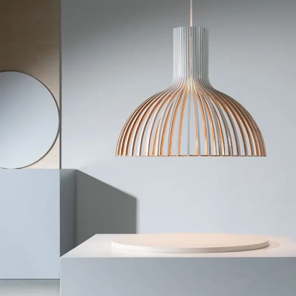 Inviting at any time of day. Gather around the serene handcrafted composition of the Victo 4250 Pendant from Secto Design. It’s a dashing minimalist piece drawing from Finnish designer Seppo Koho’s Scandinavian roots. Koho brings to the piece a refreshing appreciation for craftsmanship, beginning each design with plenty of sketches and handmade wooden prototypes. The piece uses strong, resilient birch wood, a material native to Finland. Also based in Finland, skilled craftsmen transform the raw material into form-pressed slats defined by their charming curves. These contours are fitted one at a time, resulting in a beautiful airy dome you can peek through. With the bulb hidden on top, you get a comfortable downlight and soft down glow. The light leaves behind an unforgettable silhouette of flowy contours.