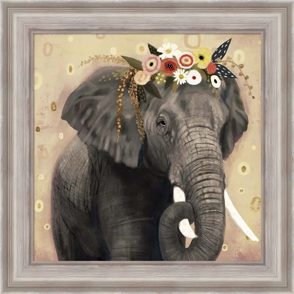 Klimt Elephant I by Victoria Barnes is a high quality piece of framed artwork. The finished size of this piece is 20" X 20". It has a Weathered White Distressed frame and is finished with high quality Acrylic Plexiglass.. 100% Satisfaction Guaranteed.