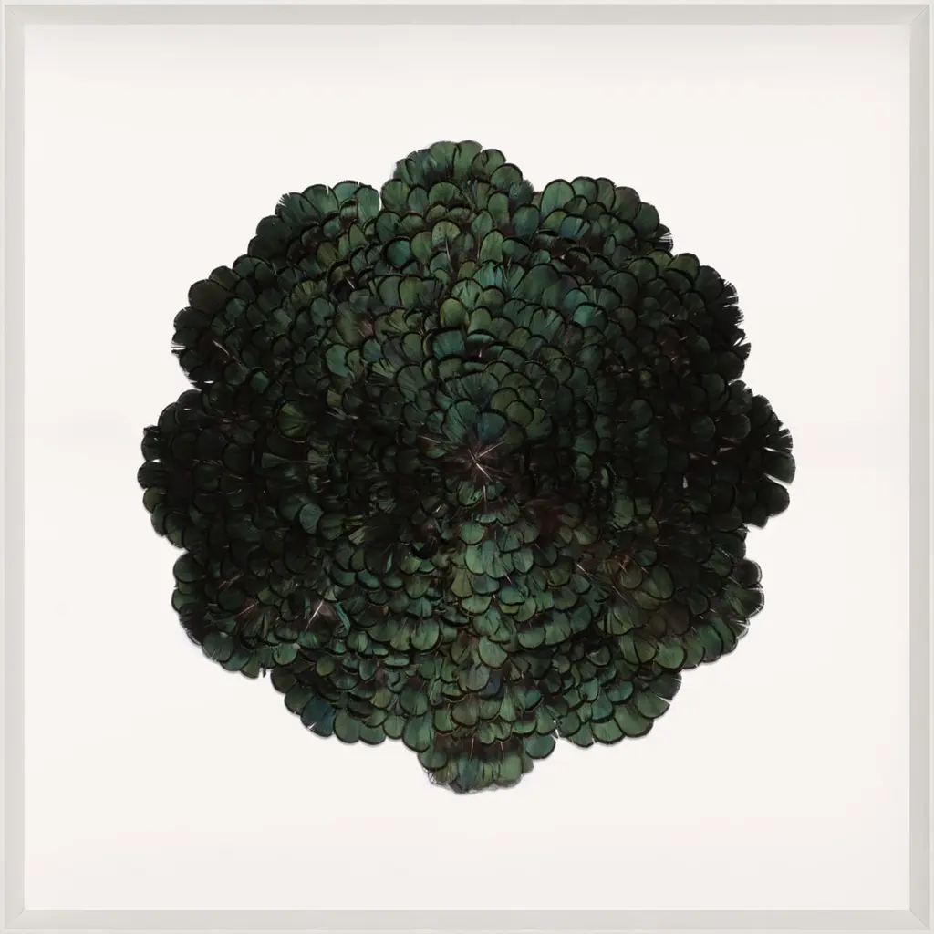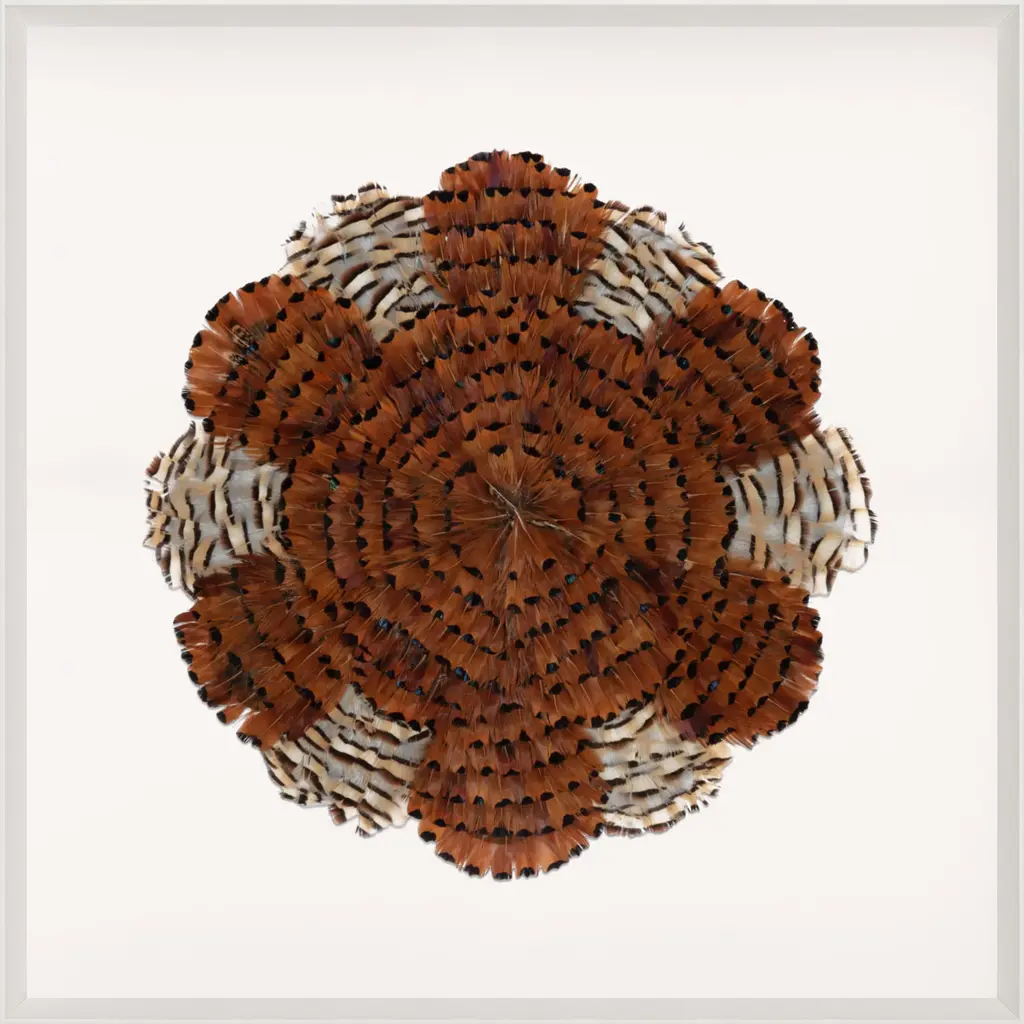 Introducing our newest Queen Victoria Feathers series, this time using real feathers that have been responsibly sourced and creating these magical designs through their amazing feather patterns. We have created one series with a single plume. The other series is using 4 plumes. The third series uses many plumes, creating this circular, nature-inspired pattern. Each collection is handmade and each one will have a slight variation based on the unique patterns in the real feathers. Framed and floated in a white wooden frame.