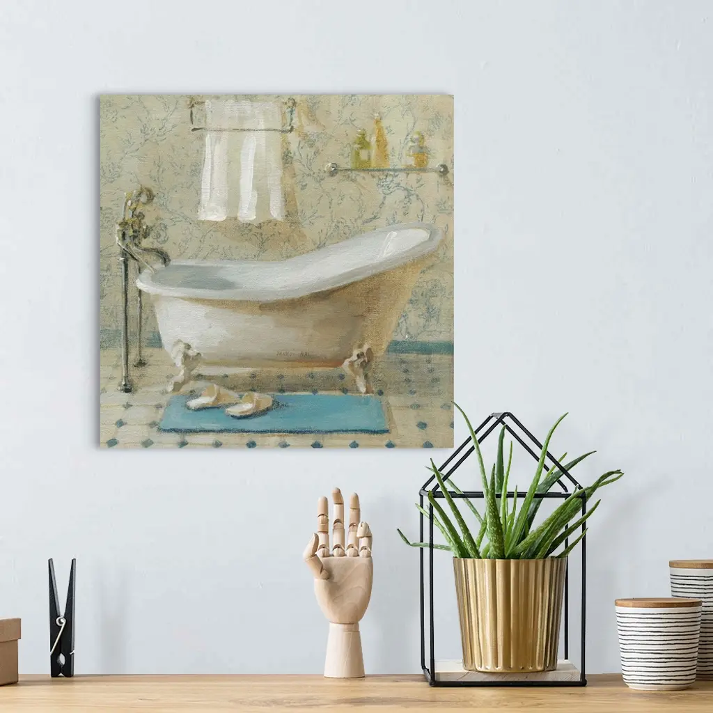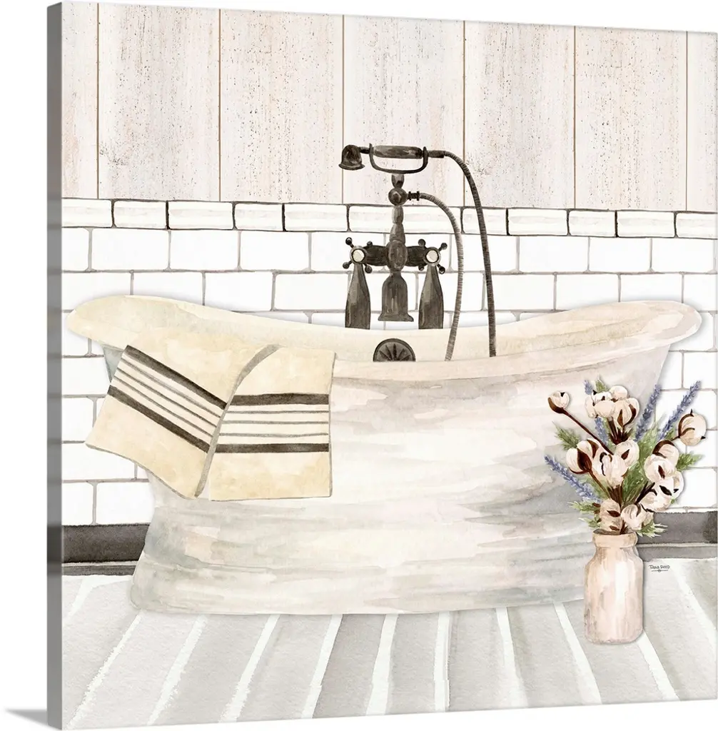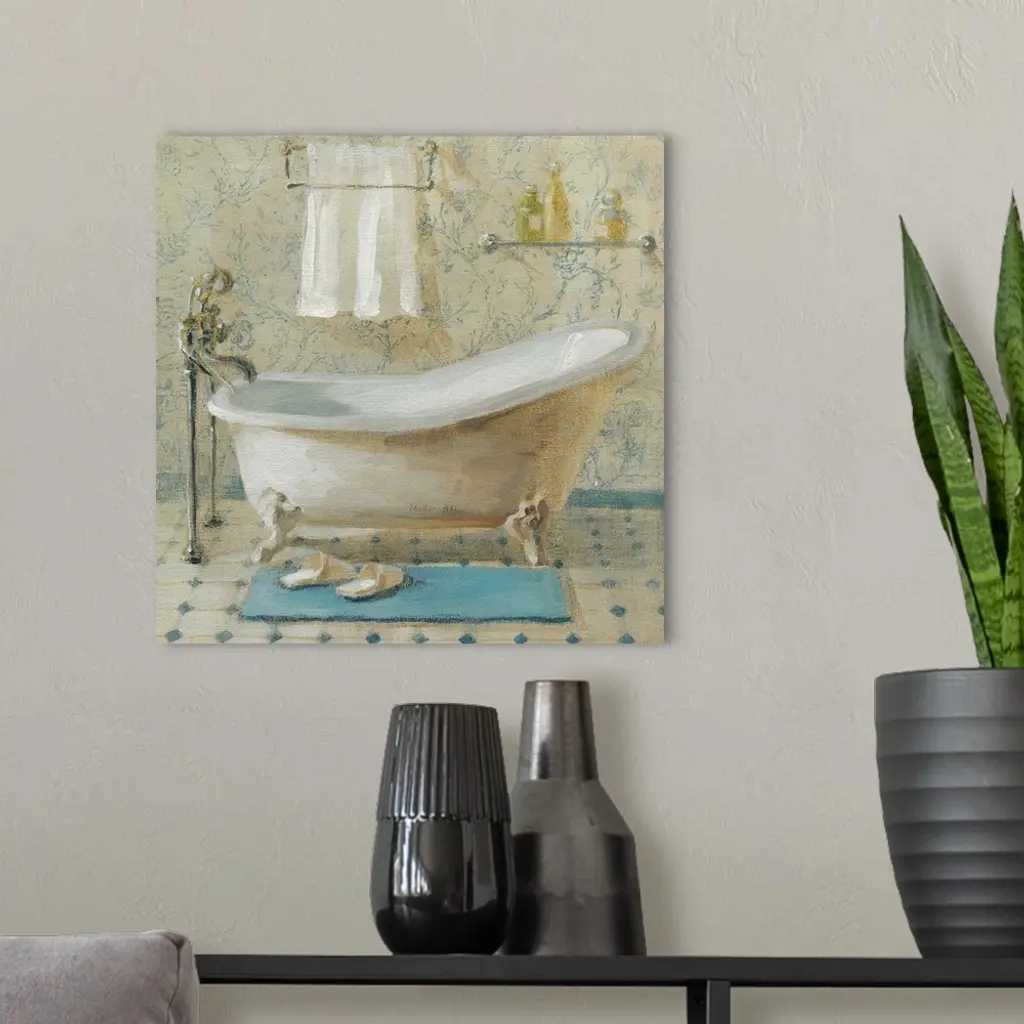 Contemporary artwork of bathroom scene, with the focus of the image on the bathtub.