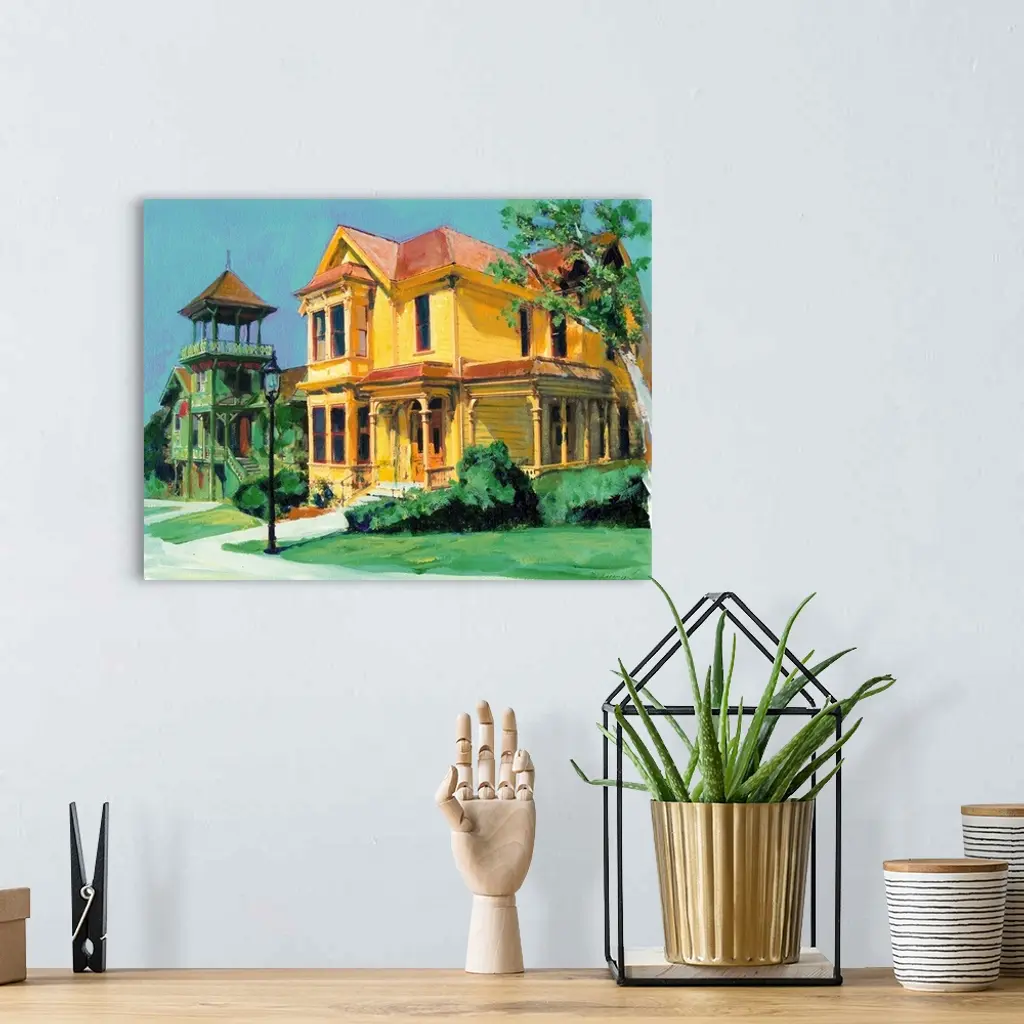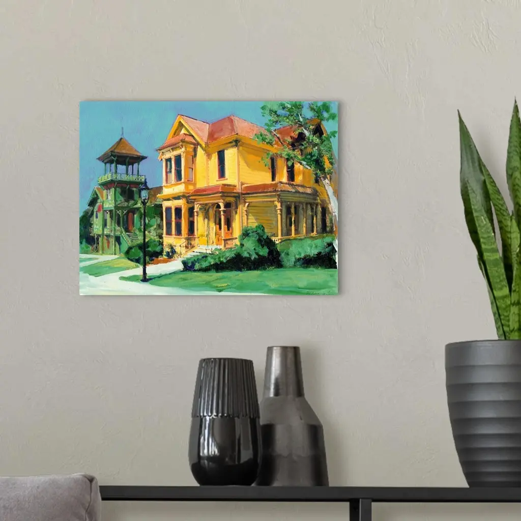 A Row of fine victorian houses in Heritage Park, Old Town San Diego, California by RD Riccoboni. Available at Beacon Artworks Gallery in Old Town San Diego State Historic ParkExperiance more of Riccoboni's paintings at his studio and gallery, Beacon Artworks, in Old town San Diego State Historic Park.This 7.8-acre county park of Victorian homes is dedicated to the preservation of San Diego's Victorian architecture. Expansion downtown after WWII threatened these structures with demolition on their original sites. Public and private funds paid for the acquisition, relocation, and restoration of these buildings.Sherman-Gilbert House. left, in foreground Bushyhead House.