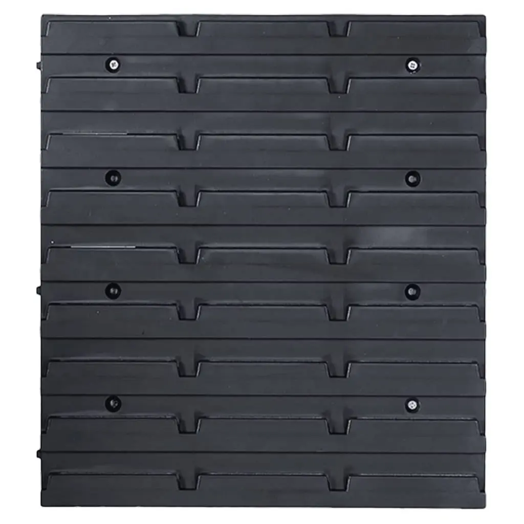 Keep your garage, craftroom and workshop organized, with this this storage bin kit with wall panels.The functional rack with stackable boxes offers many storage possibilities for small items such as screws, nails, nuts, sockets, fittings etc. The 6 solid wall panels hold various fixing accessories and 27 boxes, which can be labeled, for better overview of all small parts. You can take out the storage bins individually and stack them on top of each other. The rack set is expandable and easily mountable onto a garage or shack wall. This storage bin kit can be arranged to suit all your needs.