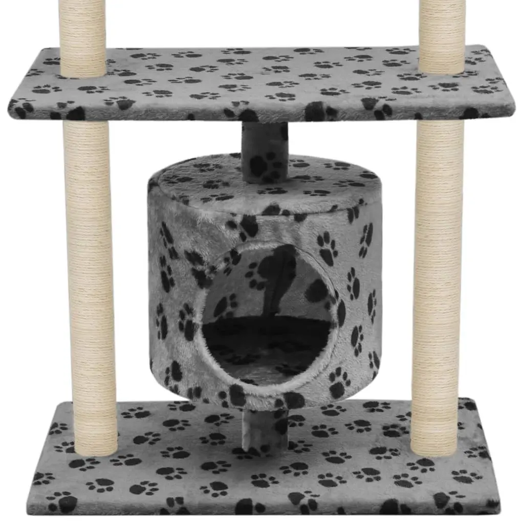 This cat tree stands 37.4 in tall and combines fun features with a stylish design, making it a top choice for your living area. With gorgeous grey fabric decorated with adorable paw prints, it's the perfect spot for your furry friends to scratch, climb, and chill, while also adding some style to your home. Durable Design: Made with engineered wood and plush fabric, it's built to last, so it’ll be a favorite for ages. Each part is tough against scratching and climbing, making it a reliable pick for lively cats.Interactive Features: Your cat will love engaging with this cat tree, thanks to the sisal scratching posts and fun platforms. The interactive design encourages your pet to climb, scratch, and explore, promoting a healthy and active lifestyle.Paw Print Aesthetics: The lovely paw print design not only adds a fun touch but also doubles as a chic accent for your living room. This combo of practicality and style brightens up your space while giving your pet a comfy spot.Compact Design: With dimensions of 17.7 in by 23.6 in and standing 37.4 in tall, this cat tree fits neatly into smaller spaces without skimping on features. It’s a fantastic solution for urban homes or anywhere with limited space.Easy Maintenance: Made with hassle-free cleaning in mind, just wipe down the soft fabric with a dry cloth to keep it fresh. Avoid harsh chemicals to make sure it stays looking its best.