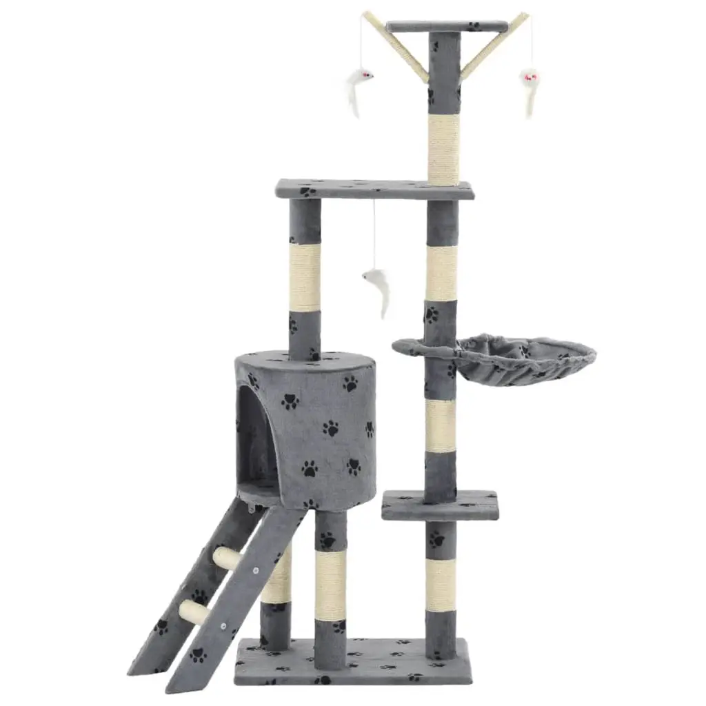 This cat tree is a stylish and practical feature for any living room, catering to your cat's need to climb and scratch. Standing at 54.3 in tall, it gives plenty of room for scratching, climbing, and lounging, all while looking great with its grey paw print patterns. Durable Construction: Made from sturdy particle board, this cat tree is built to last, perfect for pets that love to play hard. It won't tip over easily, giving your pets a steady place to hang out.Interactive Features: Comes with fun elements like three mouse toys to keep your cat active and entertained, helping to prevent boredom-related behavior.Multi-Functional Areas: Offers various lounging spots so your cat can relax or keep an eye on the room comfortably. It's designed for peaceful naps and safe lounging.Soft Plush Covering: The soft plush fabric provides a comfy surface for your pet to snuggle up against, keeping them happy while they relax. It’s gentle on their paws, making it a lovely spot to play and rest.Modern Aesthetic: With a sleek design, the grey finish fits right in with your home decor, making it both a practical and stylish piece of furniture.