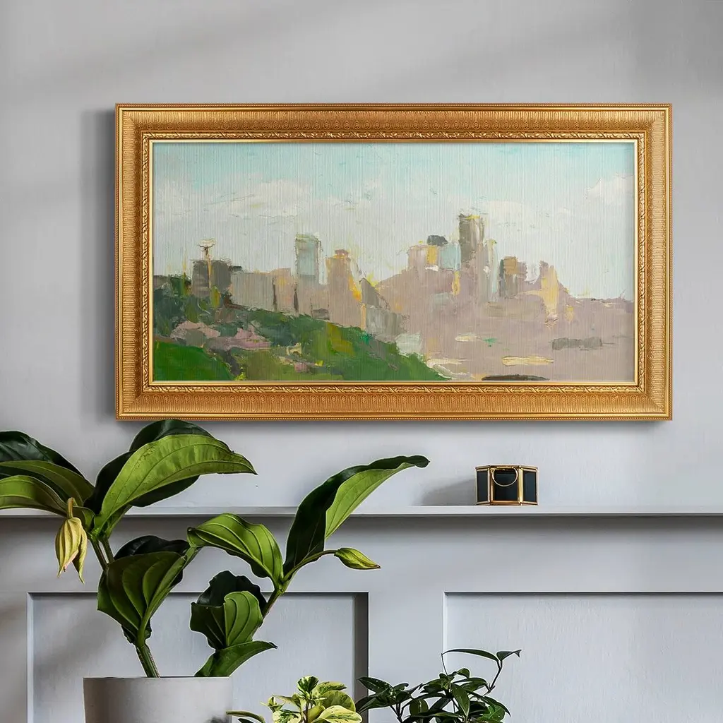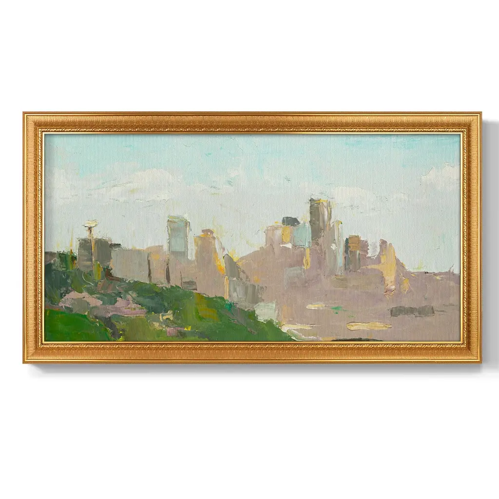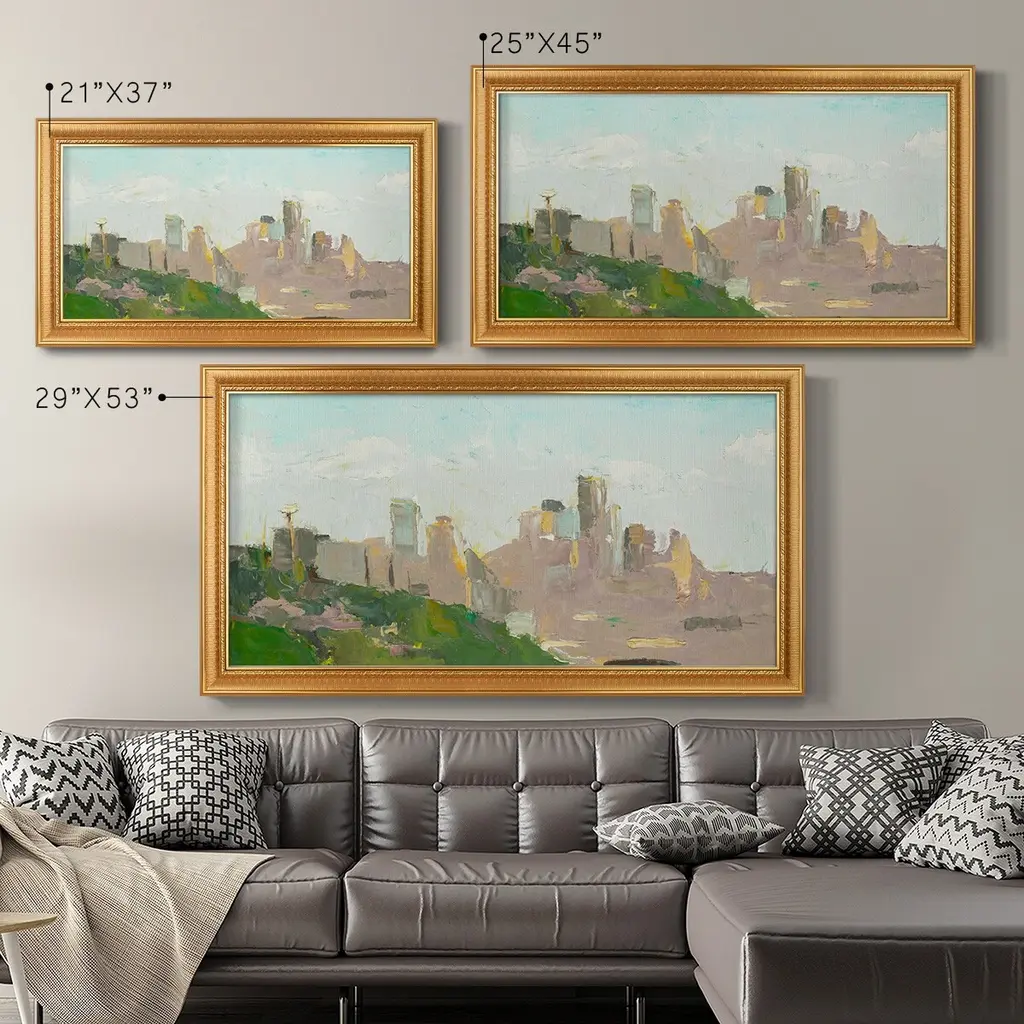 View From Ella Bailey Park IV Premium Framed Canvas- Ready to Hang A Premium Framed Canvas created to last. Framed in distressed wood and available in an array of sizes and colors Featuring a beveled a solid wood stretcher bar, each piece comes ready to hand 3 SIZES AVAILABLE 21''X37'' - Overall Size 25''X45'' - Overall Size 29''x53'' - Overall Size Each piece is made to order. Each piece comes with hanging hardware. Made in the USA Ready to Hang Giclee Paper Print Acrylic Glass Beveled Matt Board