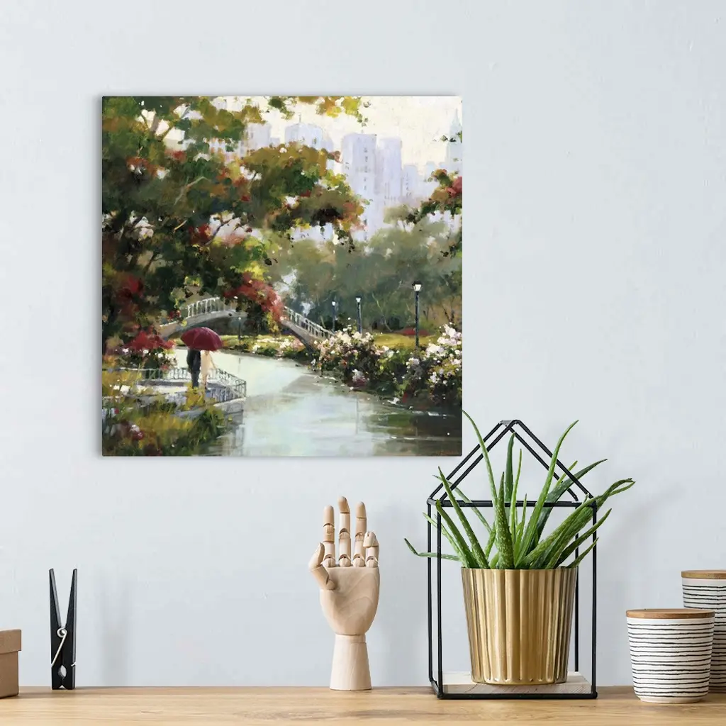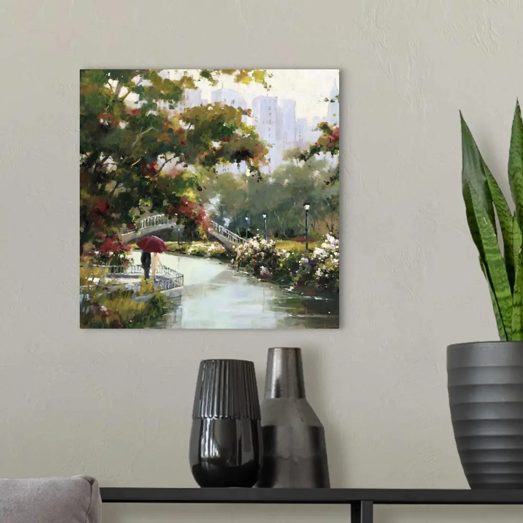 Contemporary painting of a couple standing under a red umbrella and enjoying the scenery.