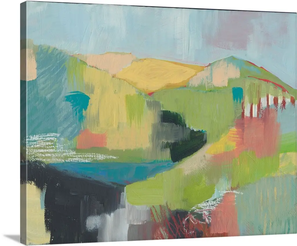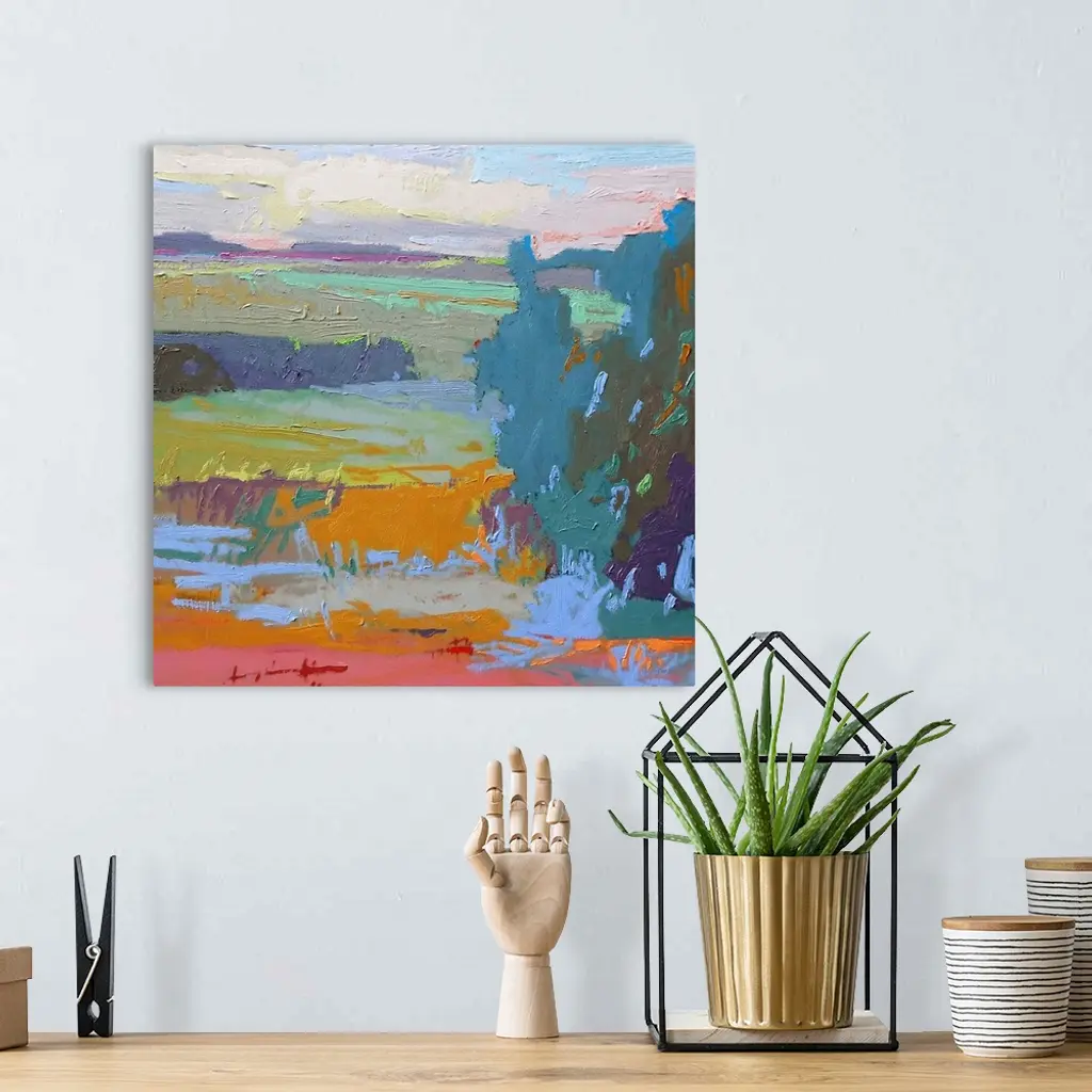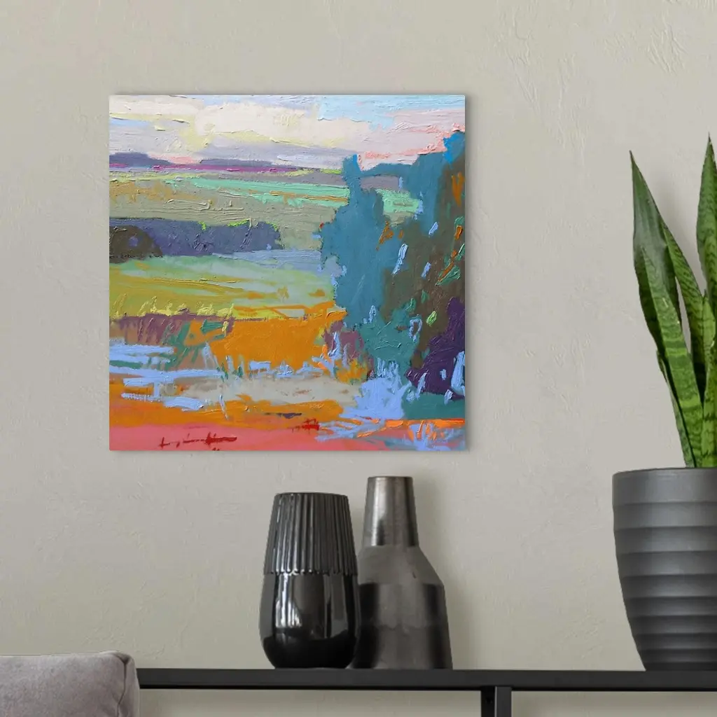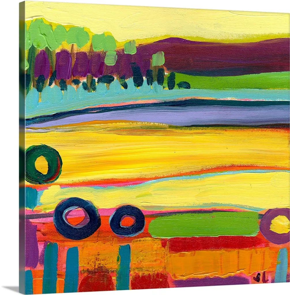 A contemporary abstract painting using vibrant colors resembling a countryside landscape.