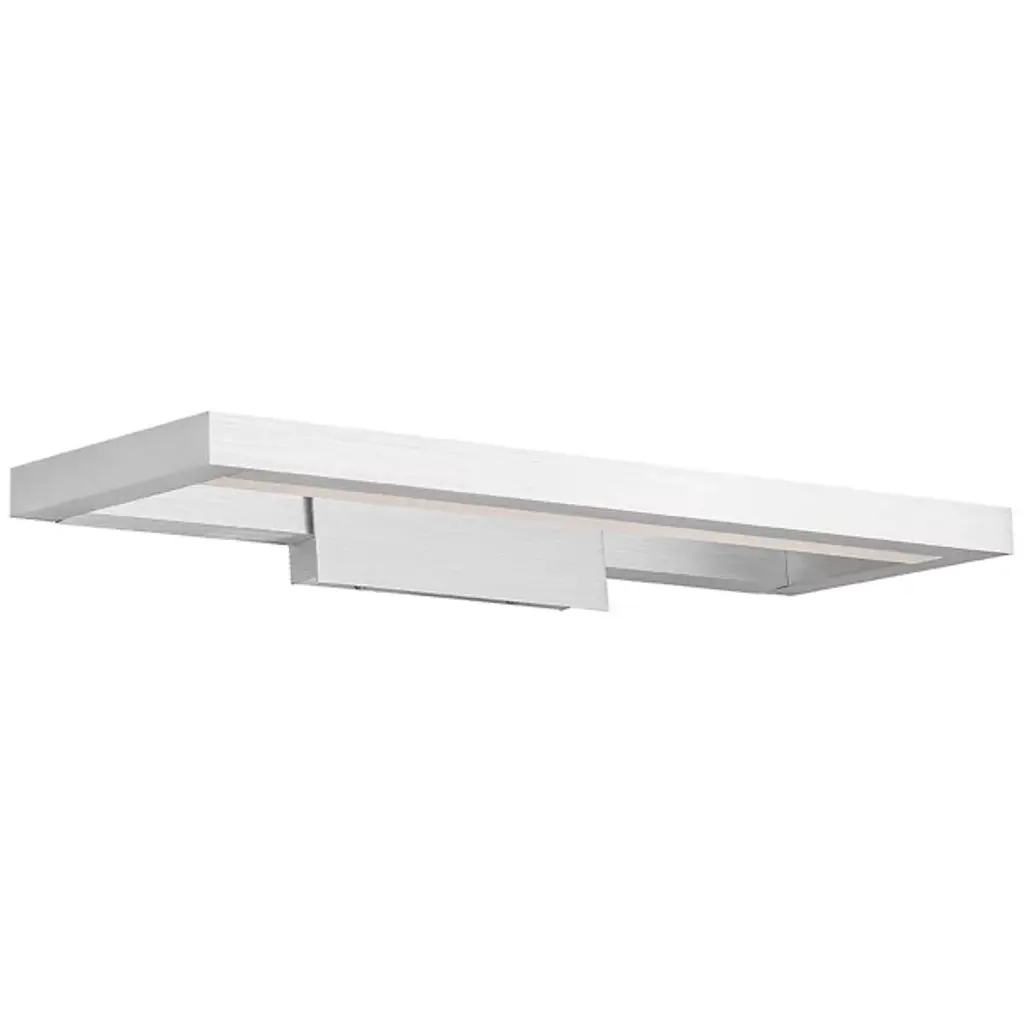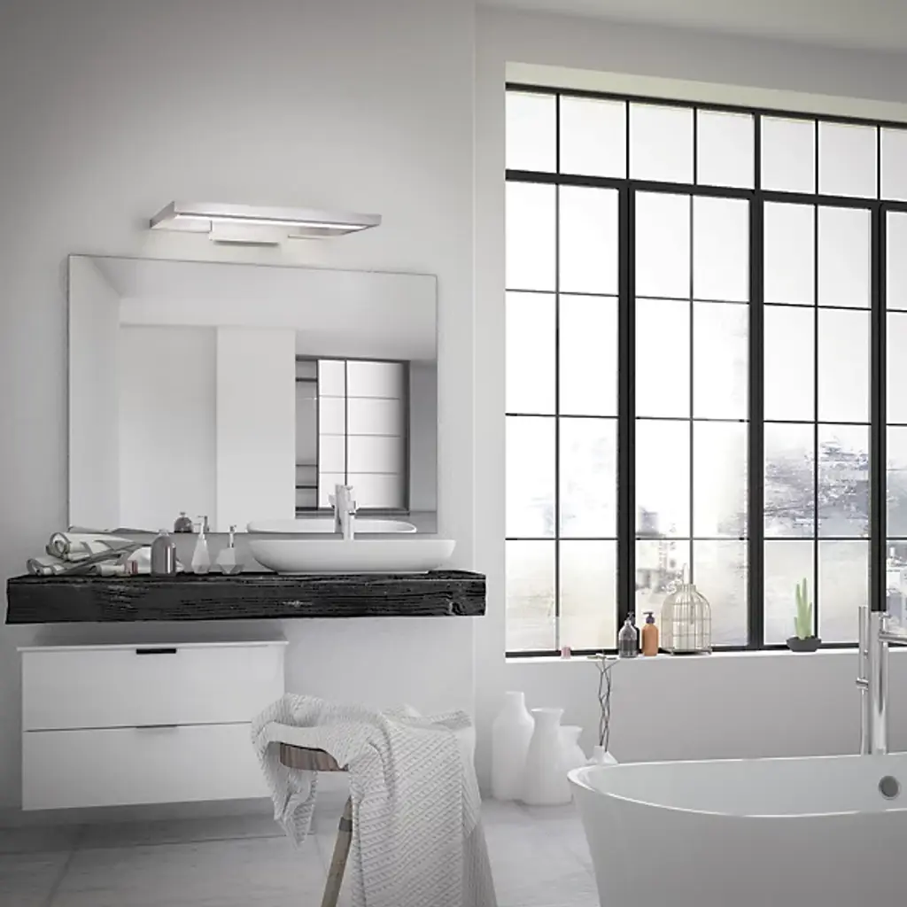 Expand your bathroom spaces with the striking View LED Vanity Light from dweLED, an elegantly simple fixture as interesting as it is inspired. Particularly well-suited to minimalist or contemporary décor and ideal over a vanity or larger mirror, it uses a small rectangular wall plate to secure an open rectangular frame in a cohesive arrangement. Illumination is provided by a damp-listed LED set up as a backlight inside an outer bar, and gentled by an etched diffuser bar of white acrylic, which casts an ideal mix of warm ambiance and effective backlight ideal for daily tasks.