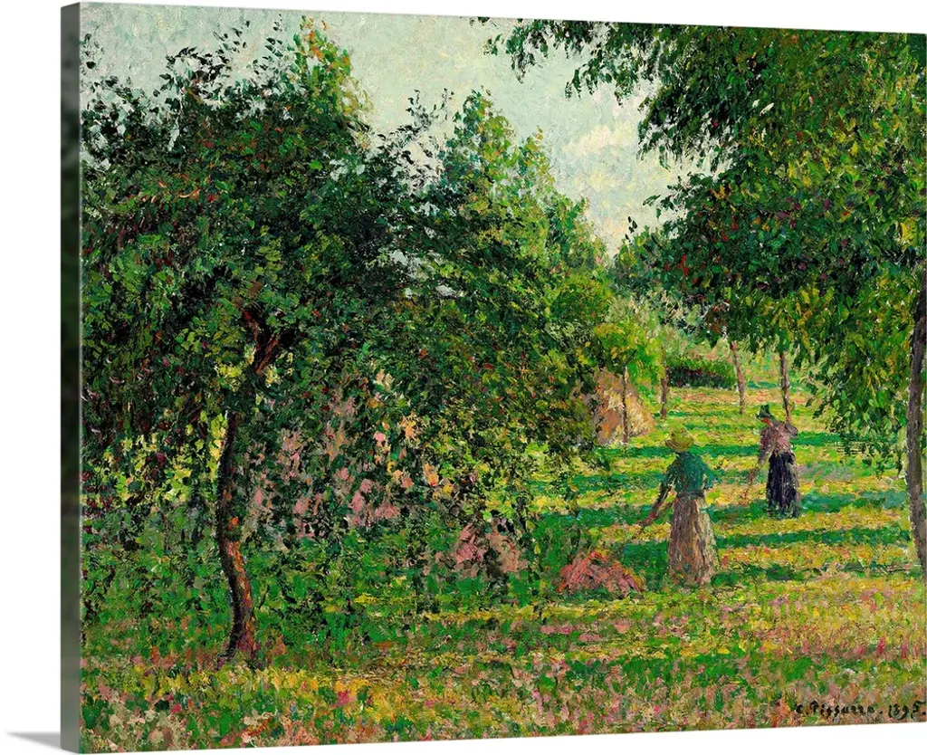 Painting of park filled with trees with town in the distance seen through three huge tree trunks.