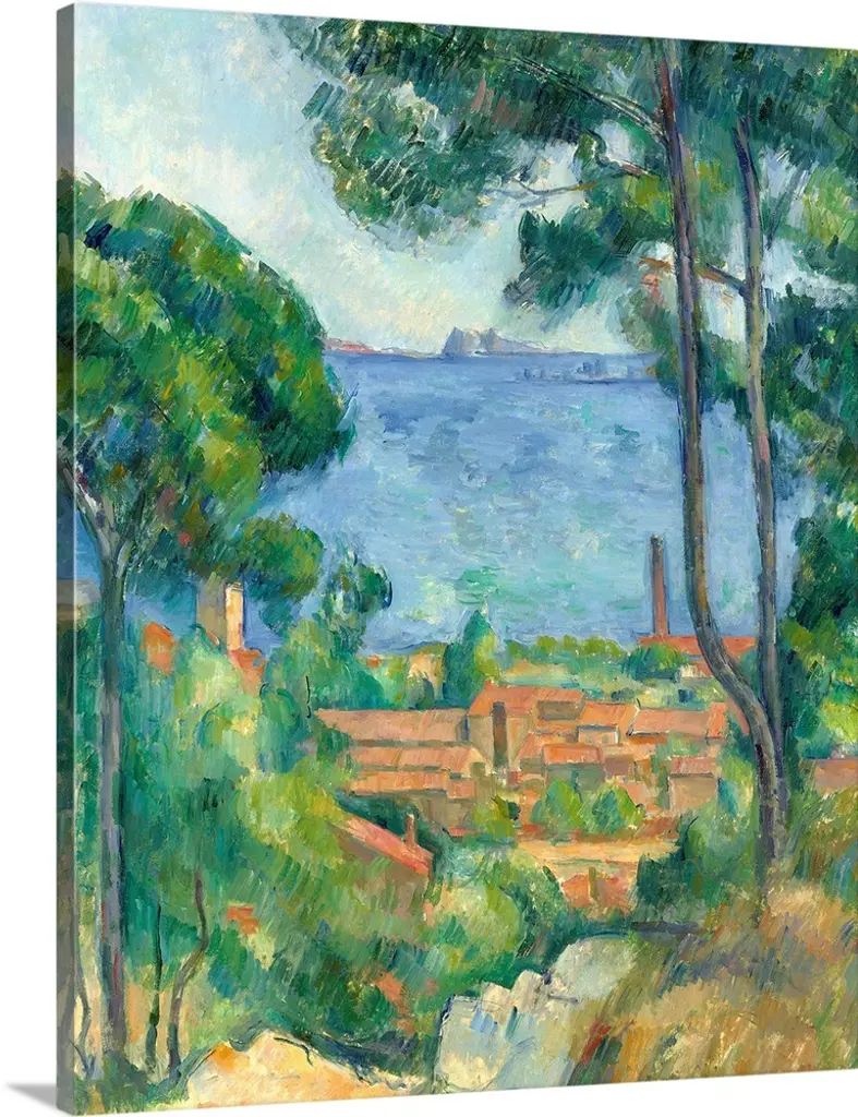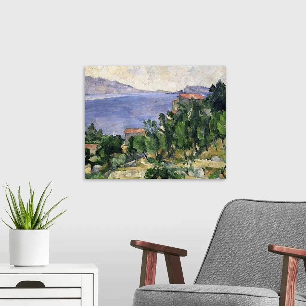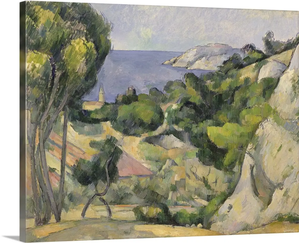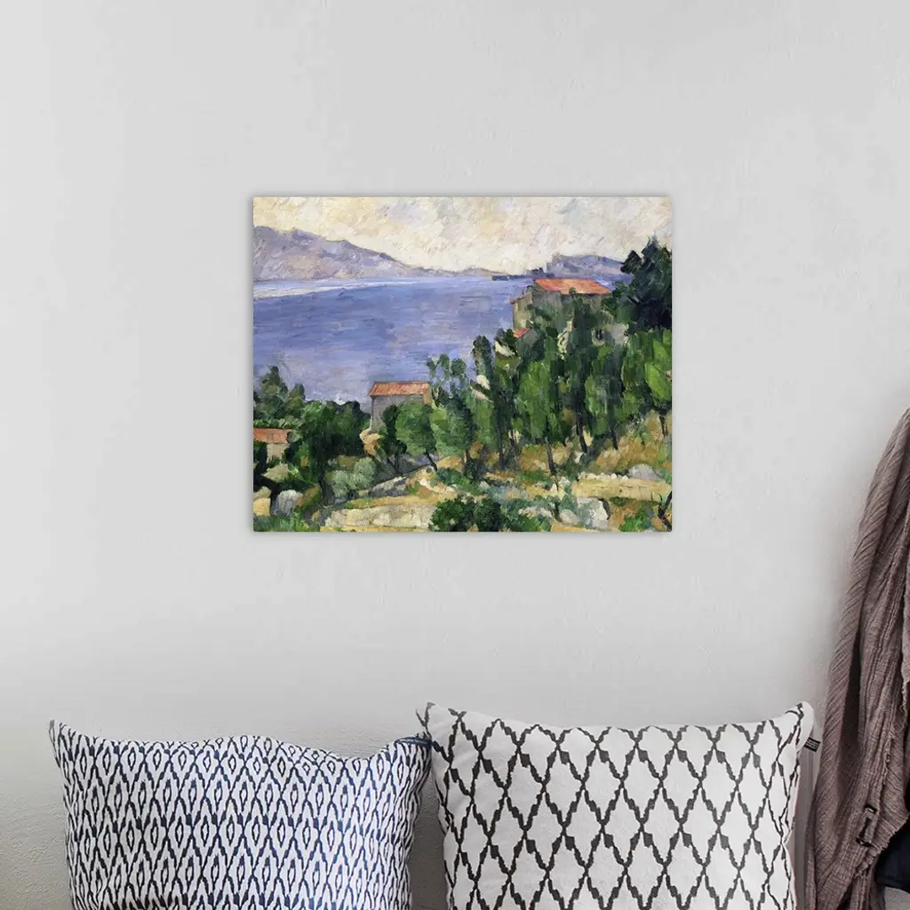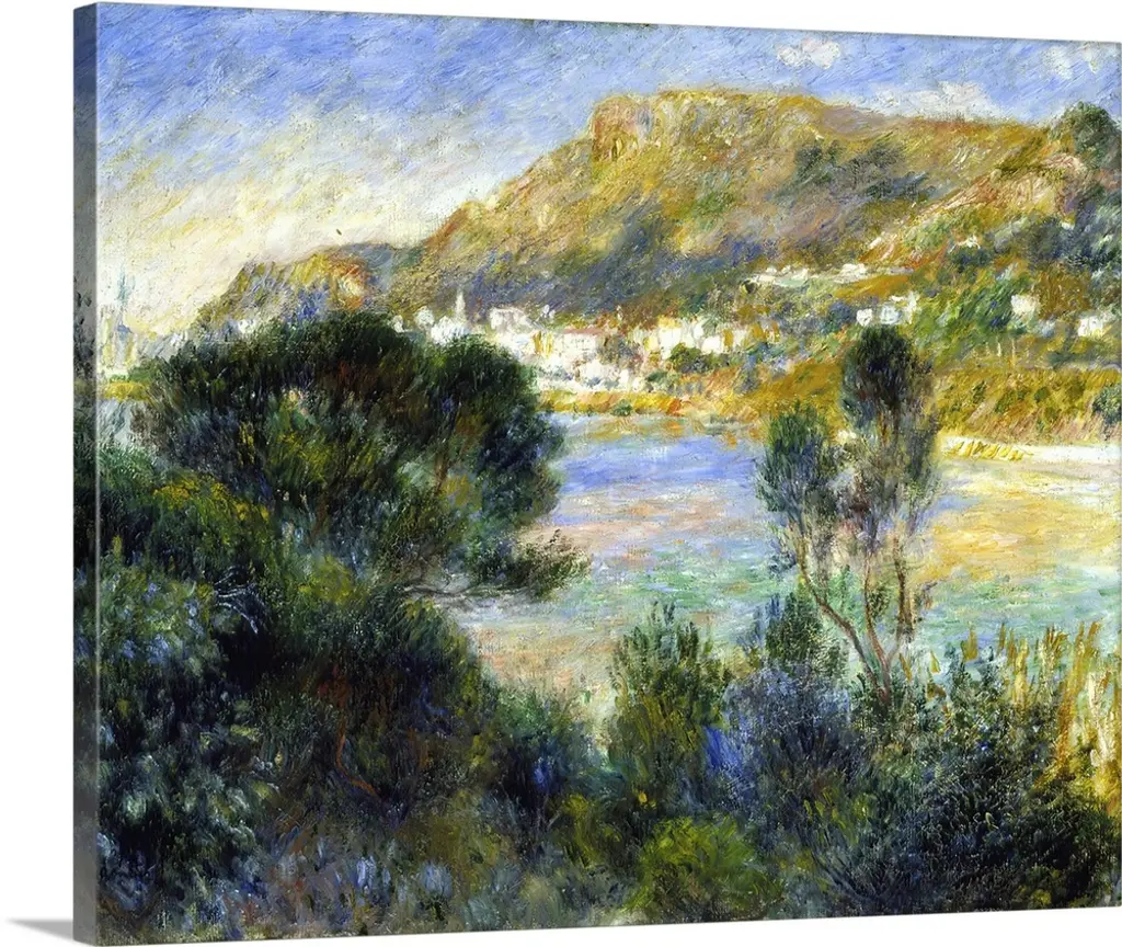 This wall art is a classic painting of a Mediterranean landscape of a sea lined with mountains and a hillside covered in trees.