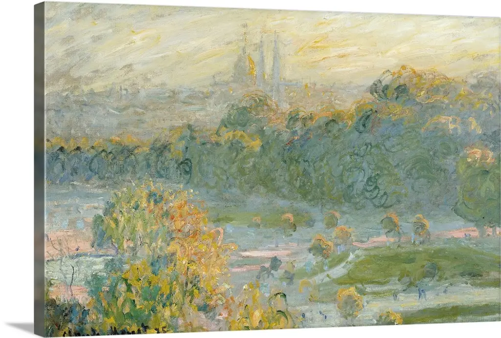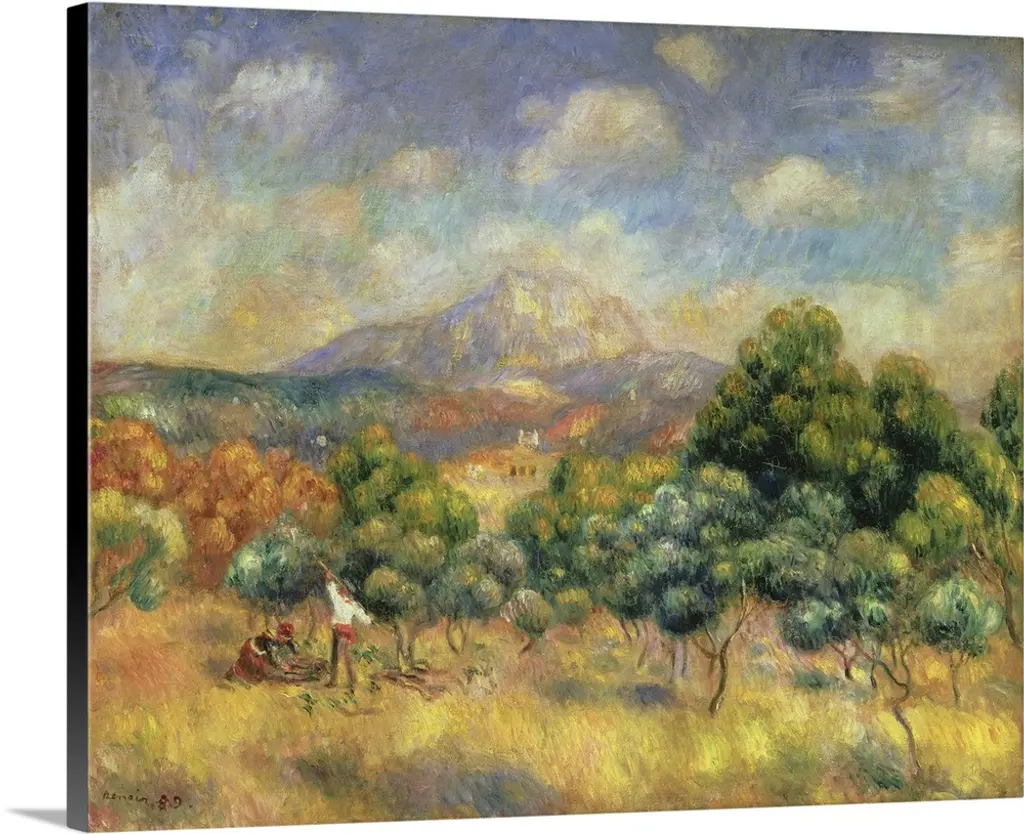 Classical oil painting of tree tops blowing in the wind with an ocean and mountains in the distance. A small town separates the sea and mountains.