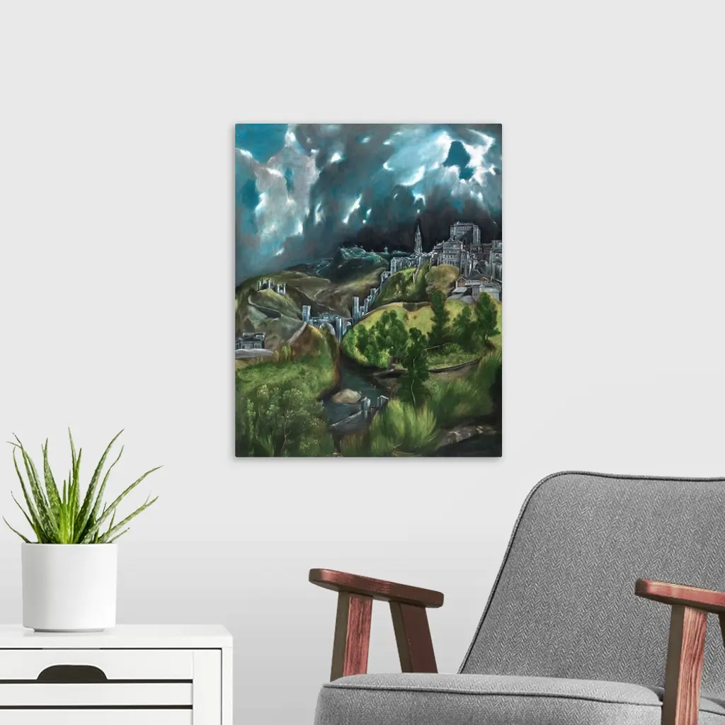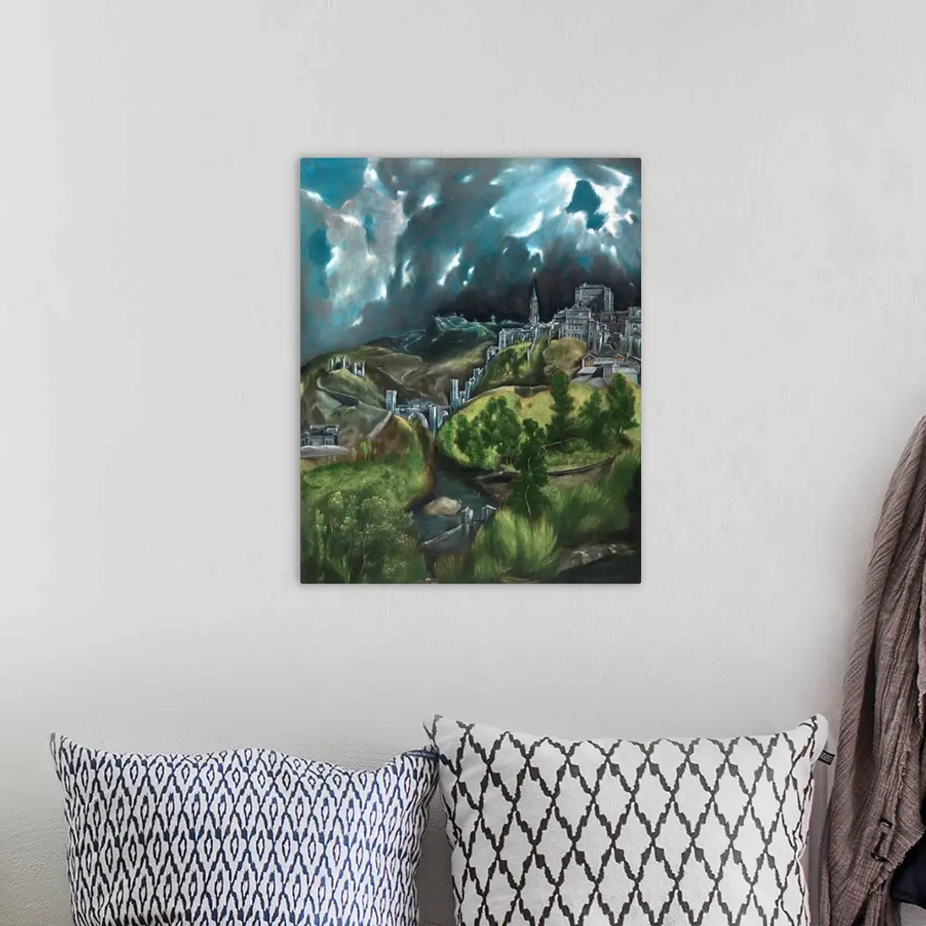In this, his greatest surviving landscape, El Greco portrays the city he lived and worked in for most of his life. The painting belongs to the tradition of emblematic city views, rather than a faithful documentary description. The view of the eastern section of Toledo from the north would have excluded the cathedral, which the artist therefore imaginatively moved to the left of the Alcazar (the royal palace). Other buildings represented in the painting include the ancient Alcantara Bridge, and on the other side of the river Tagus, the Castle of San Servando.