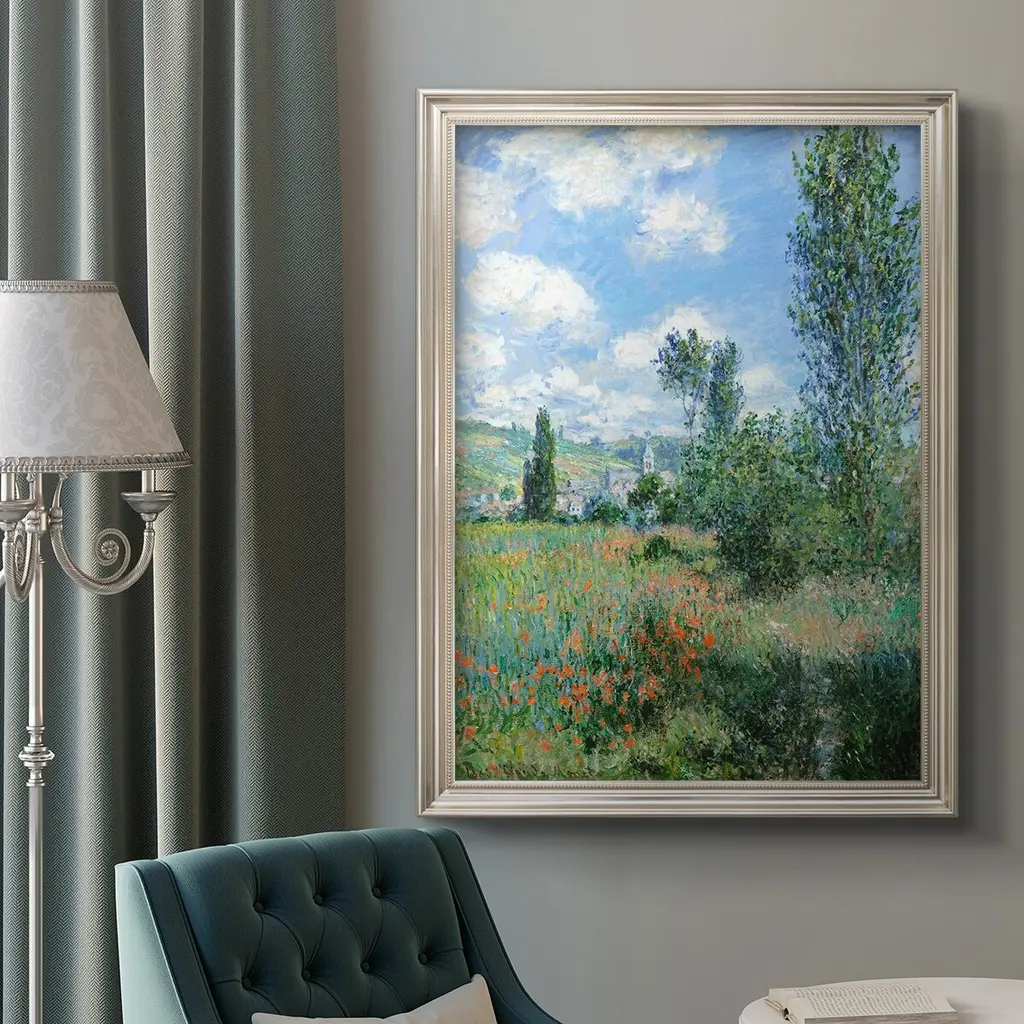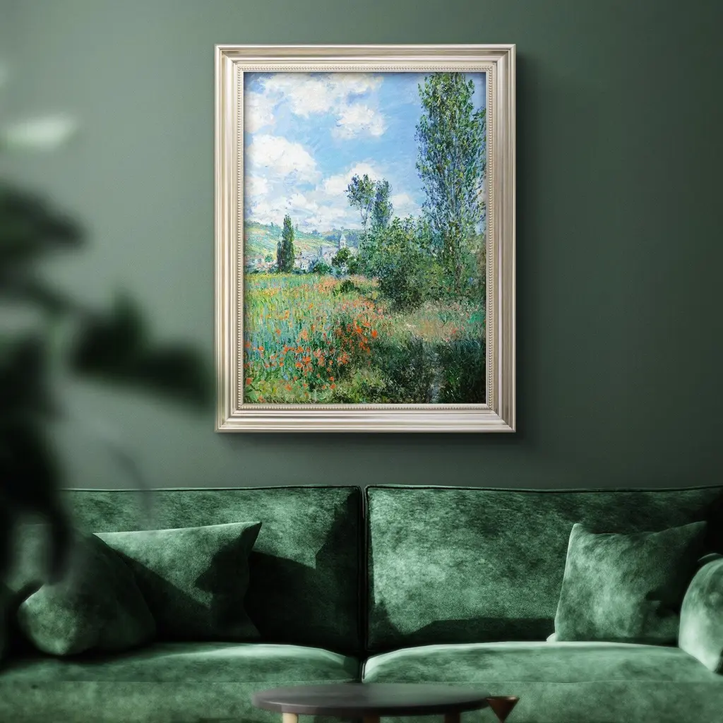 View of Vétheuil Premium Framed Canvas- Ready to Hang A Premium Framed Canvas created to last. Framed in distressed wood and available in an array of sizes and colors Featuring a beveled a solid wood stretcher bar, each piece comes ready to hand 3 SIZES AVAILABLE 16''X20'' - Overall Size 18'X27'' - Overall Size 24''x36'' - Overall Size Each piece is made to order. Each piece comes with hanging hardware. Made in the USA Ready to Hang Giclee Paper Print Acrylic Glass Beveled Matt Board