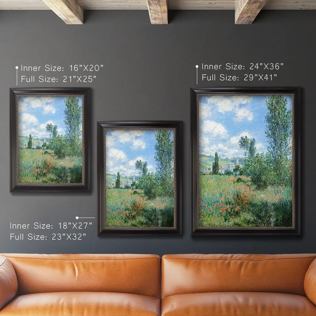 View of Vétheuil Premium Framed Canvas- Ready to Hang A Premium Framed Canvas created to last. Framed in distressed wood and available in an array of sizes and colors Featuring a beveled a solid wood stretcher bar, each piece comes ready to hand 3 SIZES AVAILABLE 16''X20'' - Overall Size 18'X27'' - Overall Size 24''x36'' - Overall Size Each piece is made to order. Each piece comes with hanging hardware. Made in the USA Ready to Hang Giclee Paper Print Acrylic Glass Beveled Matt Board