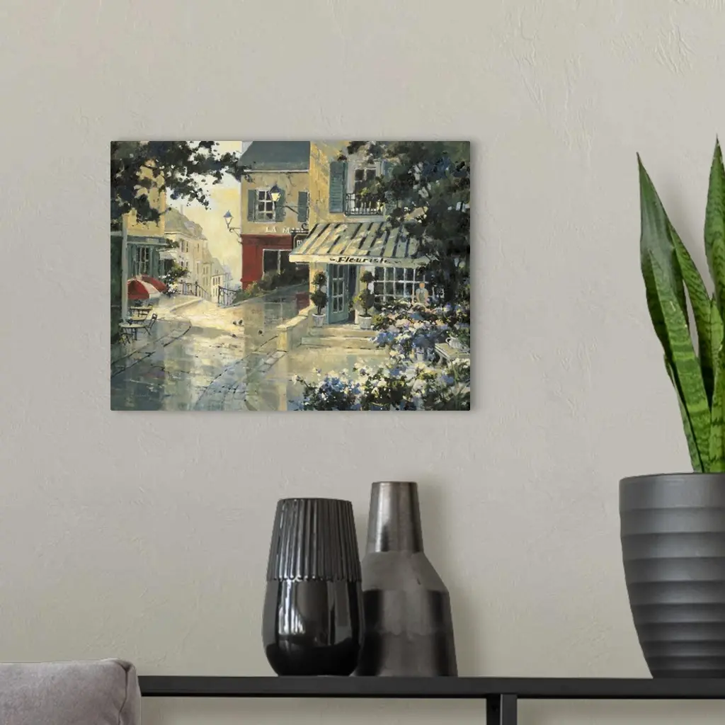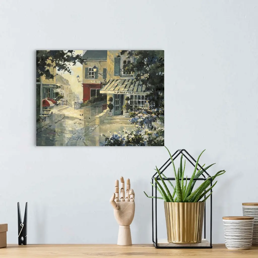 Contemporary painting of a city street corner florist shop.