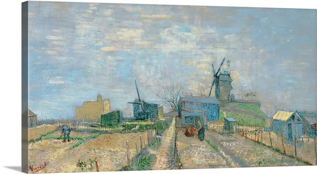 18" x 27" Vincent Van Gogh Le Moulin de la Galette gallery wrap premium canvas print reproduced to meet museum quality standards. Our Museum quality canvas prints are produced using high-precision print technology for a more accurate reproduction printed on high quality canvas with fade-resistant, archival inks. Our progressive business model allows us to offer works of art to you at the best wholesale pricing, significantly less than art gallery prices, affordable to all. This artwork is hand stretched onto wooden stretcher bars by one of our expert framers. Our gallery wrap canvas print comes with hardware, ready to hang on your wall. We present a comprehensive collection of exceptional canvas art reproductions by Vincent Van Gogh.