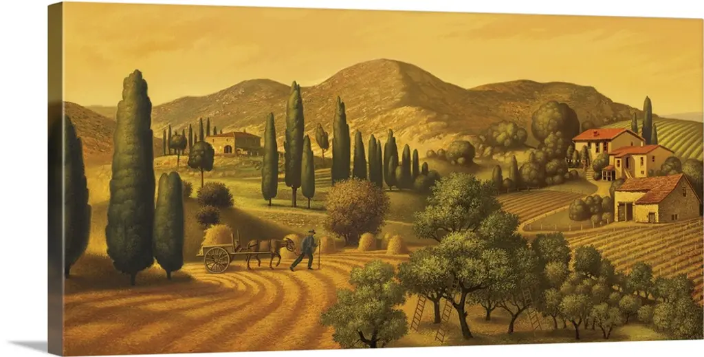 This is horizontal painting by a contemporary artist showing crops growing in the country side around a rustic farm house and barn.