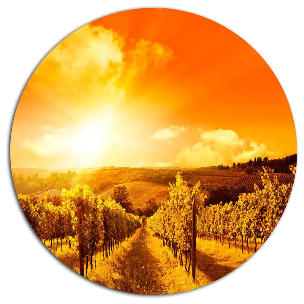 Bring Contemporary Abstraction to your home with this large Circle Metal wall art. This Vineyard with Stormy Sunset Metal Artwork makes it the focal point of any room or office. - White Gloss Coating ensures colors are extra vibrant with light reflection.- Aluminum grade Sheet Metal with 1 inch mounting frame on the back giving the illusion that the artwork is floating on the wall..- Mounting Brackets are included along with instructions.- High Quality Digital images are created directly into a glossy aluminum panel producing a stunning and captivating print into the glossy finish of the metal.- Water, Fire and Scratch resistant HD Aluminum panels.- Looks better than any photo paper and guaranteed to last at least 20 years- Easy to clean with a microfiber cloth. Colors are far superior to regular Canvas Art. - Easy to Hang