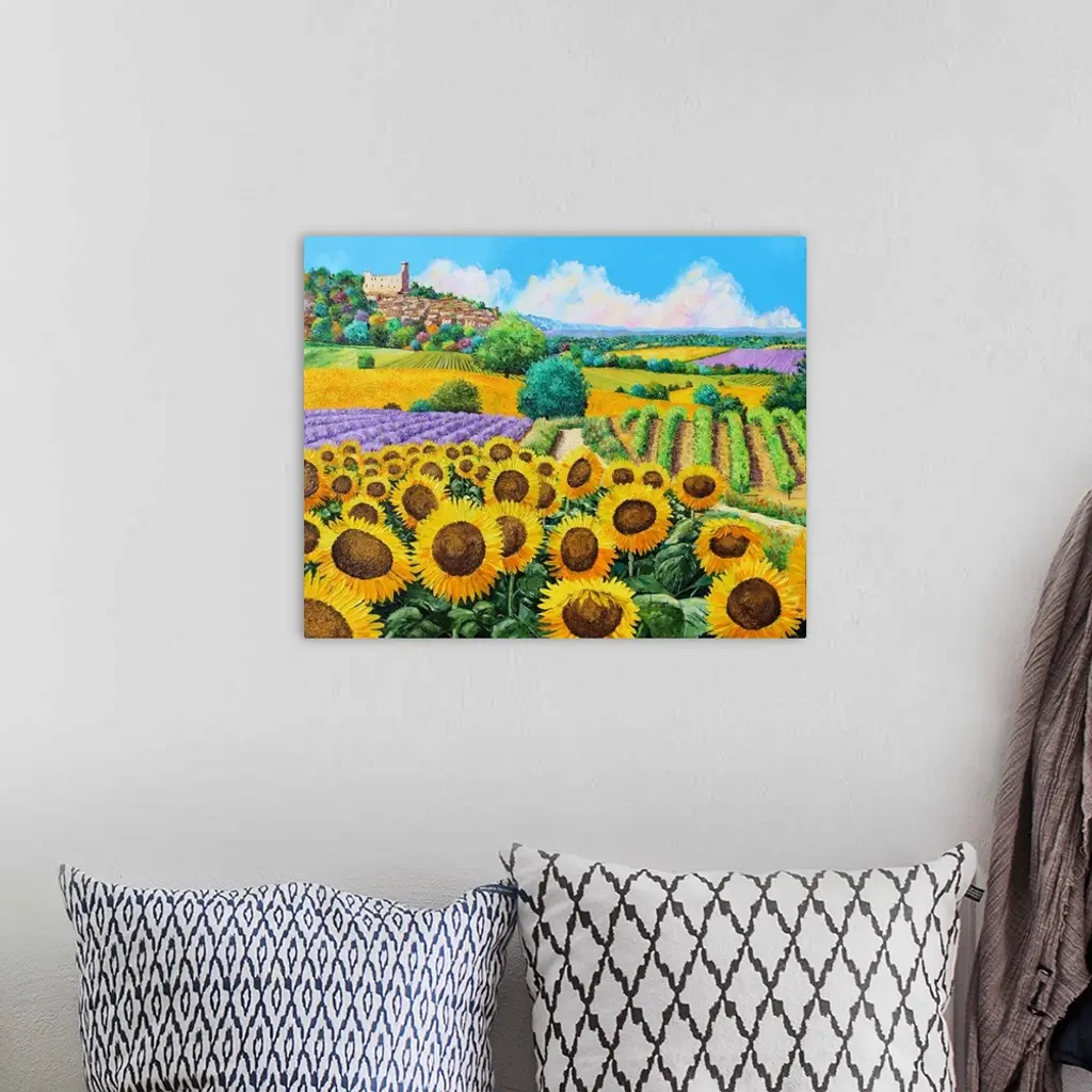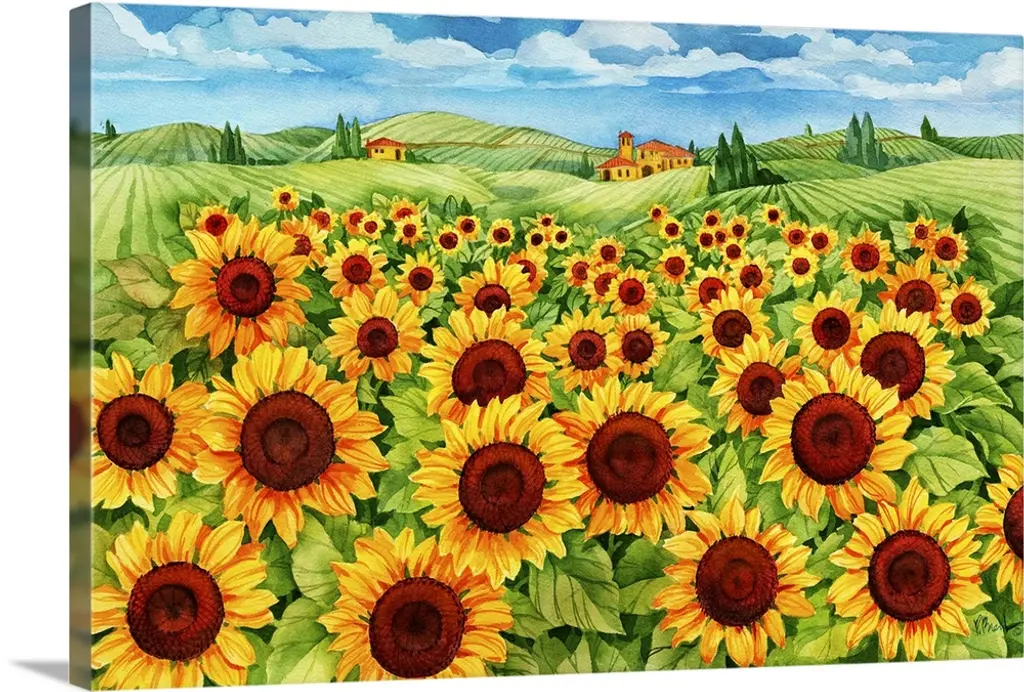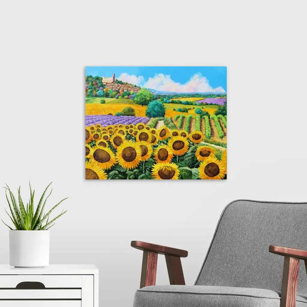 Painting of a countryside field of massive yellow sunflowers and rows of vineyards,