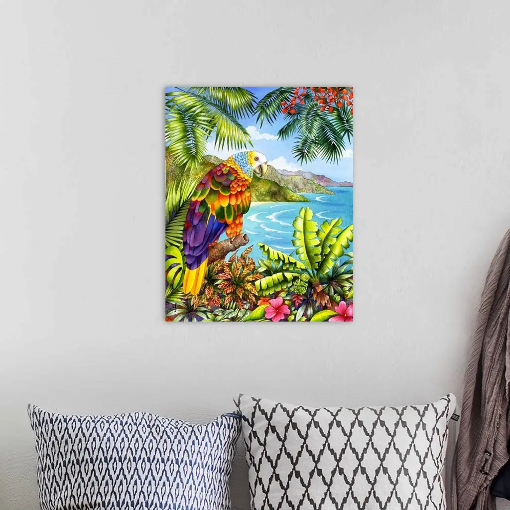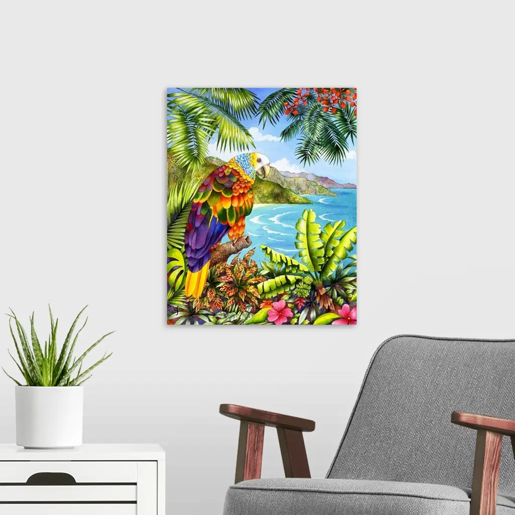 Tropical themed artwork using bright vivid colors to depict the flowers and animals of the environment.