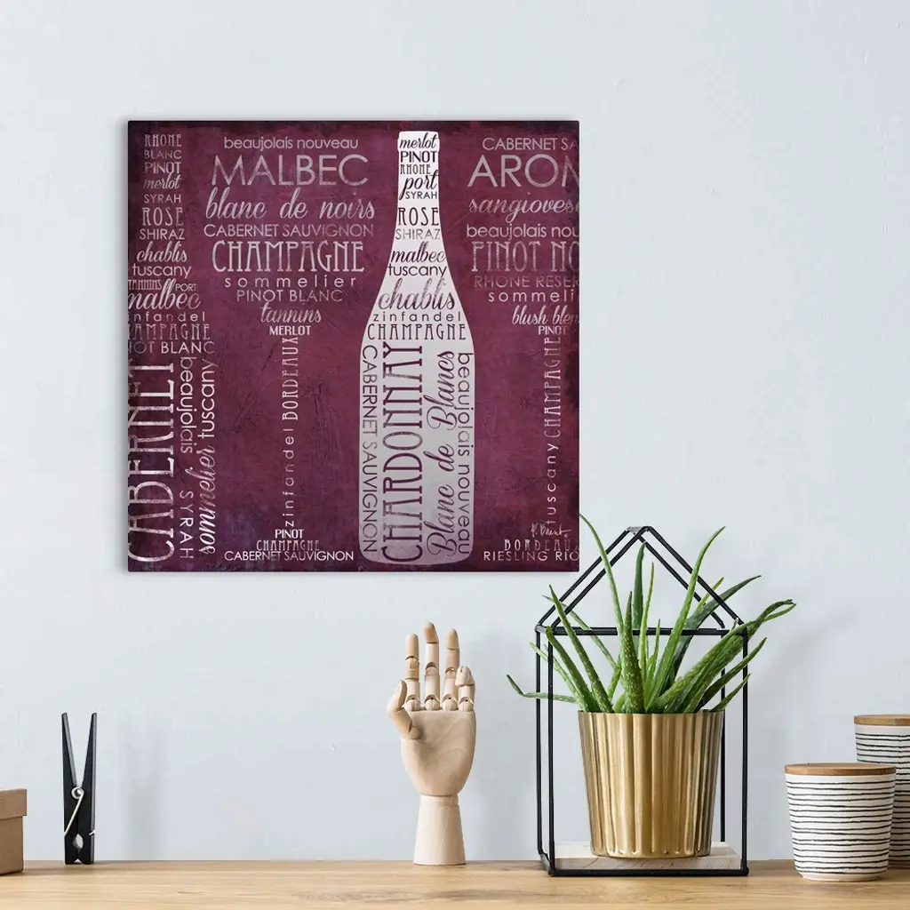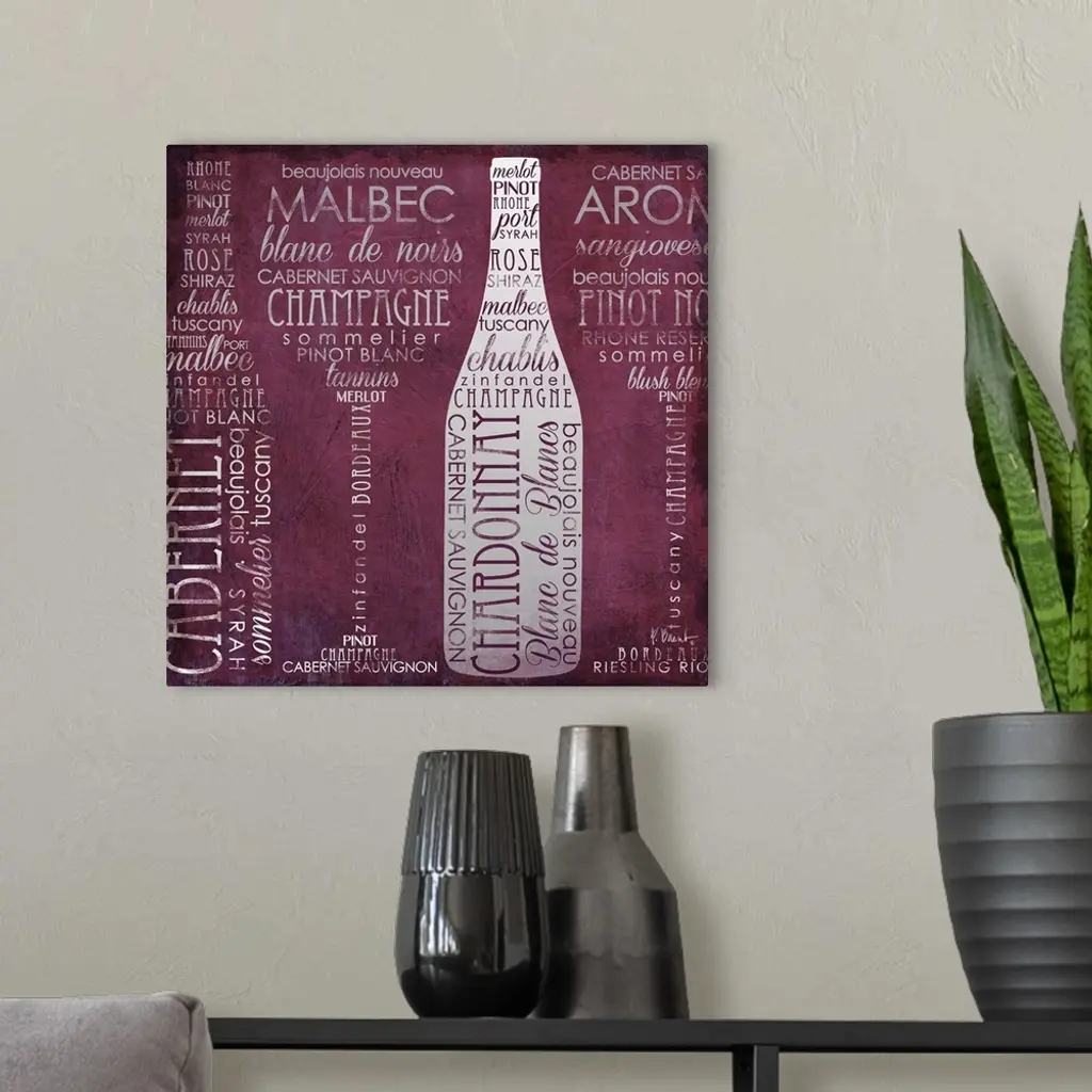 Typography artwork of wine-themed words arranged to from wine bottles and glasses.