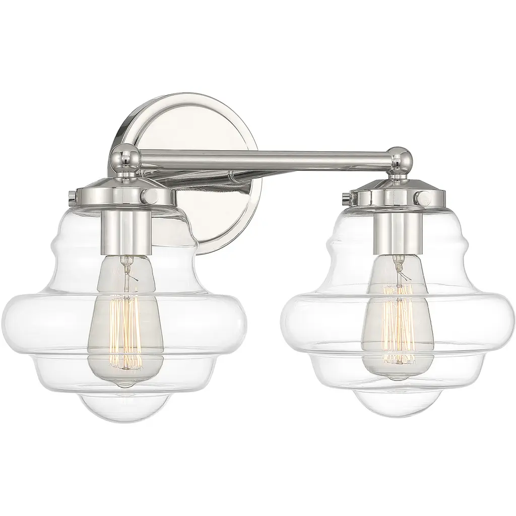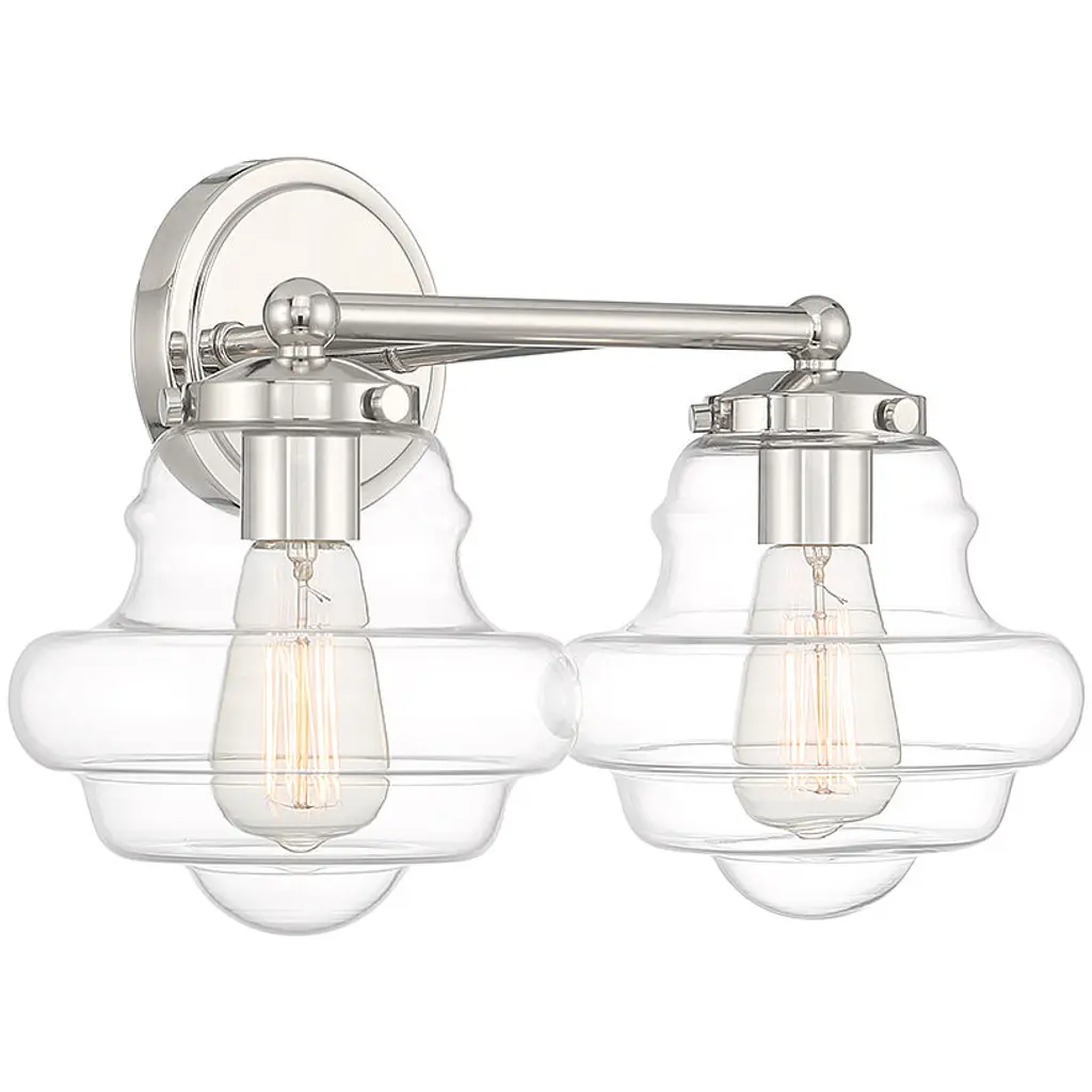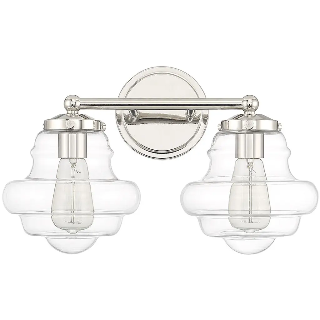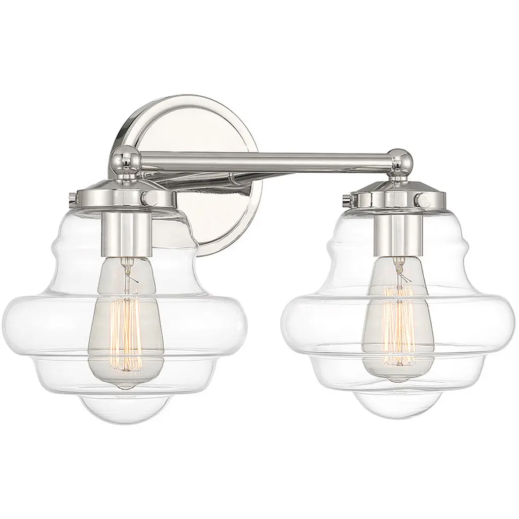 Bring a bold touch of vintage schoolhouse style to any space with this 2-light bath vanity light. It features a polished nickel finish and curving clear glass shades with eye-catching detailing. 10" height, 16.5" width. Uses standard size bulbs, max 60 watts per bulb. LED bulb compatible.
