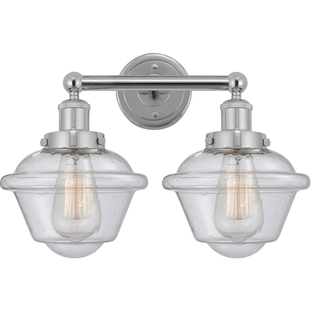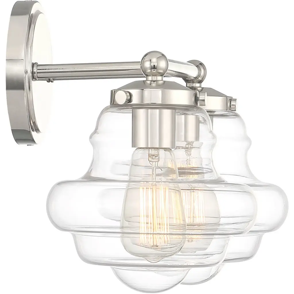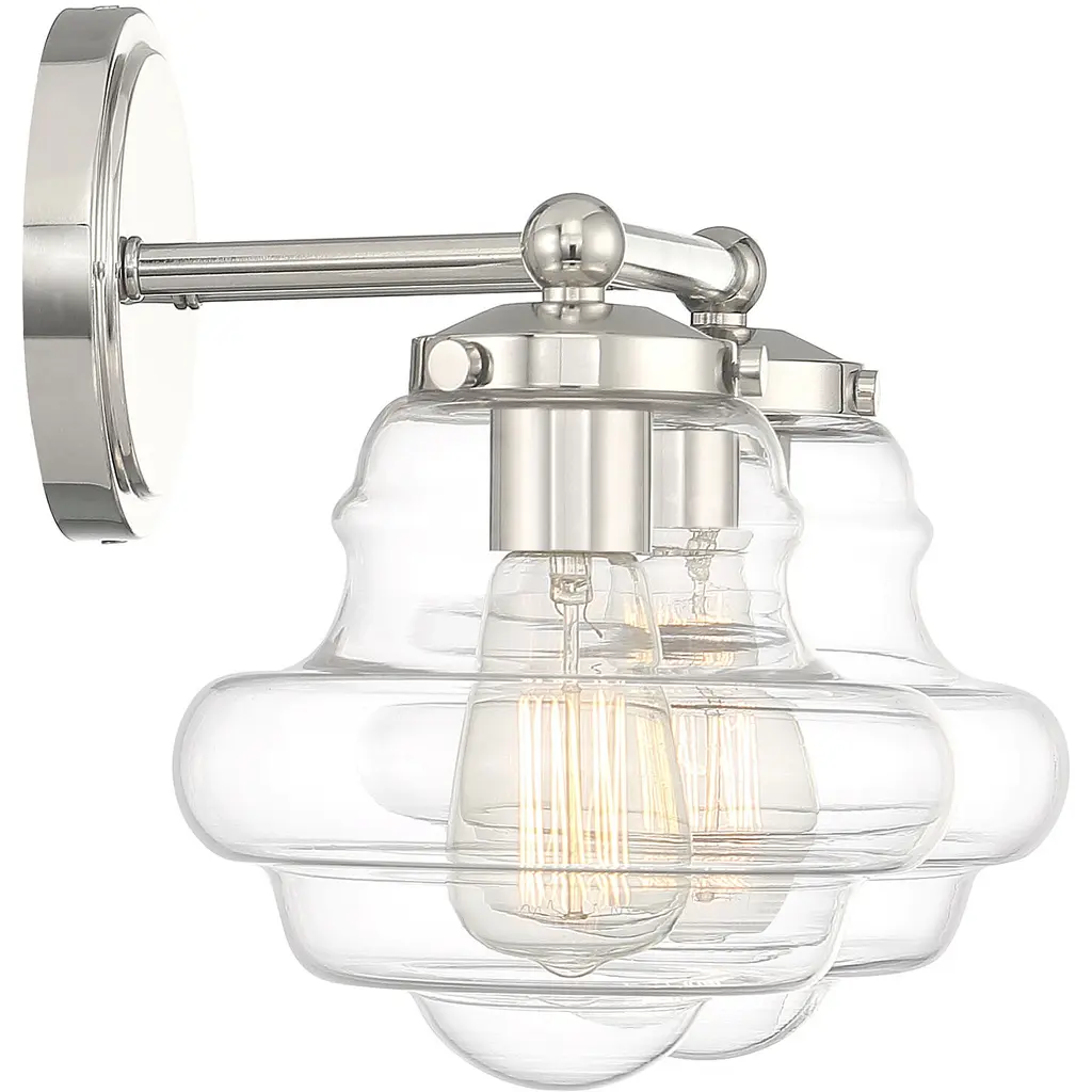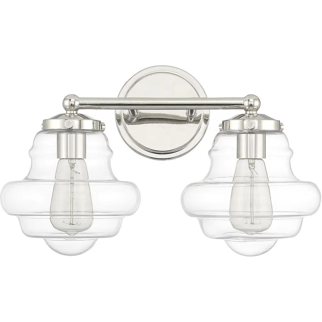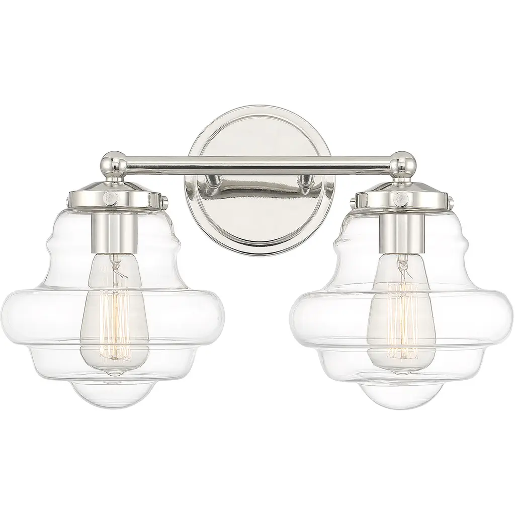 Bring a bold touch of vintage schoolhouse style to any space with this 2-light bath vanity light. It features a polished nickel finish and curving clear glass shades with eye-catching detailing. 10" height, 16.5" width. Uses standard size bulbs, max 60 watts per bulb. LED bulb compatible.