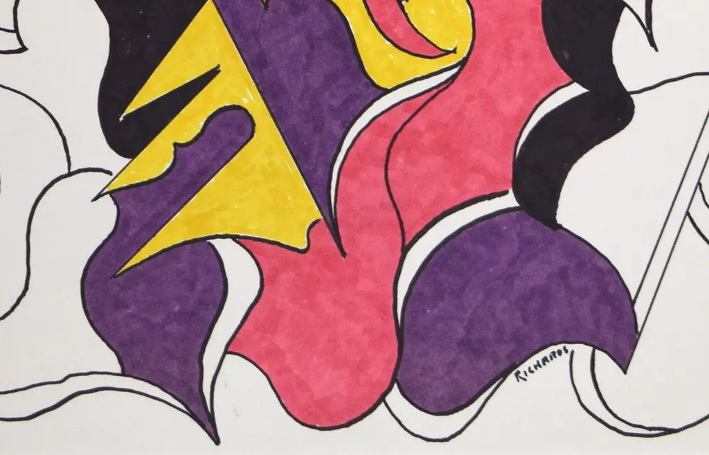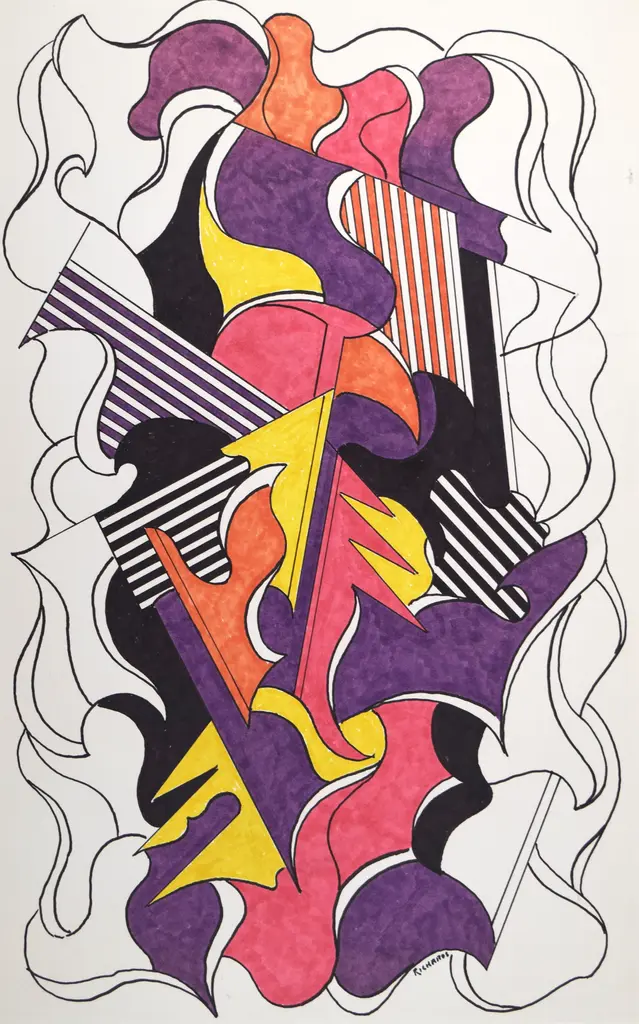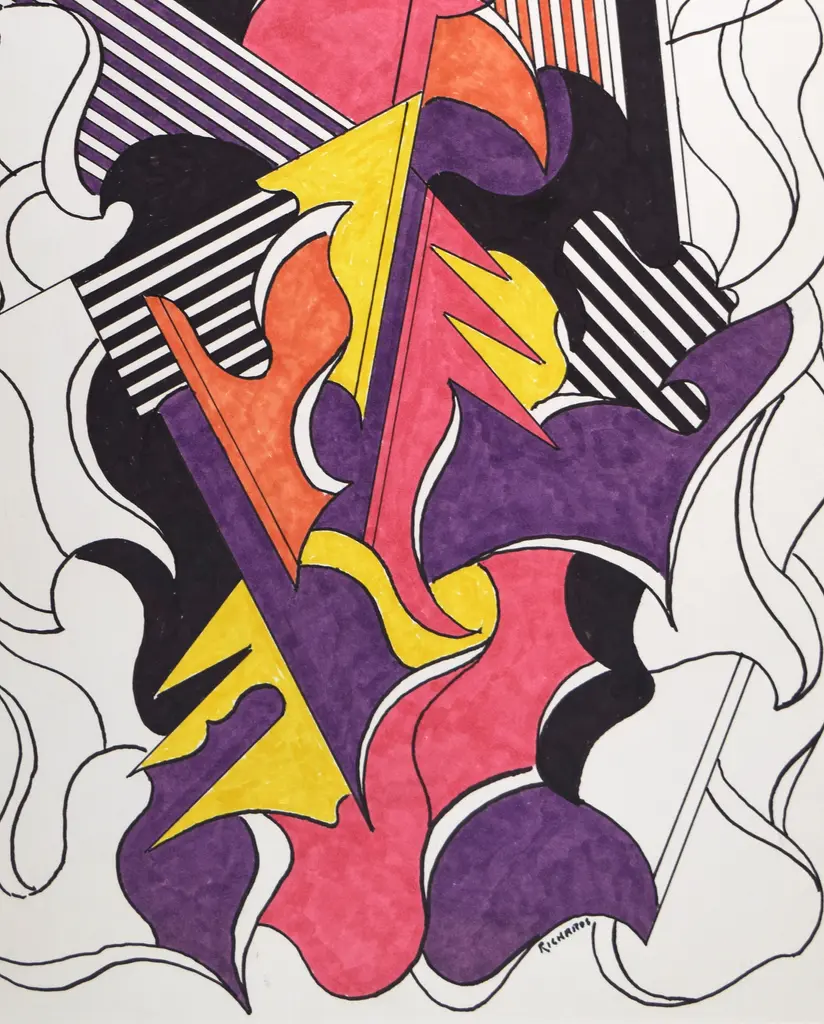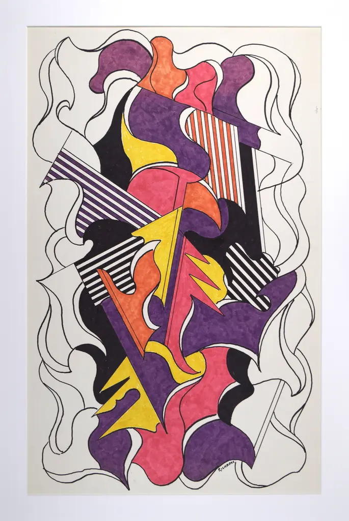 Vintage abstract painting by artist and mid century, american modernist furniture concept designer Irving Richards. Pen & Ink and Marker on paper, presented matted and in modern blonde/cream minimalist wood frame. Signed lower right, from a collection of works Circa 1970s.