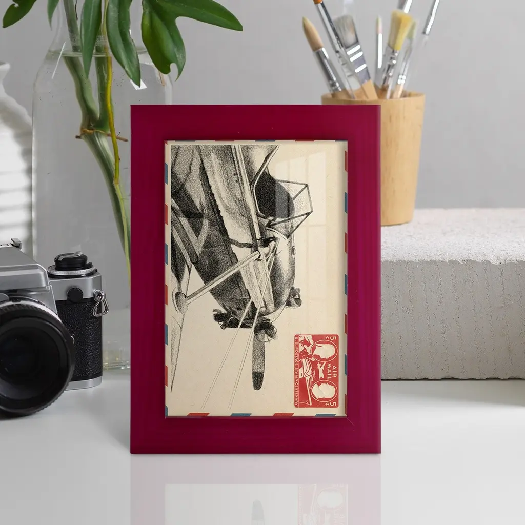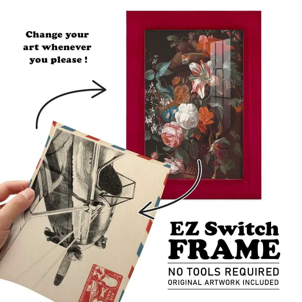 Vintage Airmail I -EZ SWITCH Framed Print w/glass-Cherry Red A delightful, framed print. Featuring a solid wood frame with real wood glass. This premium print is giclee quality. In addition, every frame features a removable back and table top stand. This allows you to change your art in the future or to just stand the art on a table for a new look. We are sure you'll enjoy our new series of EZ SWITCH Framed Art. Solid Wood Frame Real Glass Removable / Replaceable Art Built in Tabletop Stand Sizes range from 4x6 up to 12x15 - buy just one or pair them up as sets as you see fit.