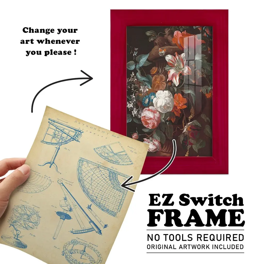 Vintage Astronomy I -EZ SWITCH Framed Print w/glass-Cherry Red A delightful, framed print. Featuring a solid wood frame with real wood glass. This premium print is giclee quality. In addition, every frame features a removable back and table top stand. This allows you to change your art in the future or to just stand the art on a table for a new look. We are sure you'll enjoy our new series of EZ SWITCH Framed Art. Solid Wood Frame Real Glass Removable / Replaceable Art Built in Tabletop Stand Sizes range from 4x6 up to 12x15 - buy just one or pair them up as sets as you see fit.