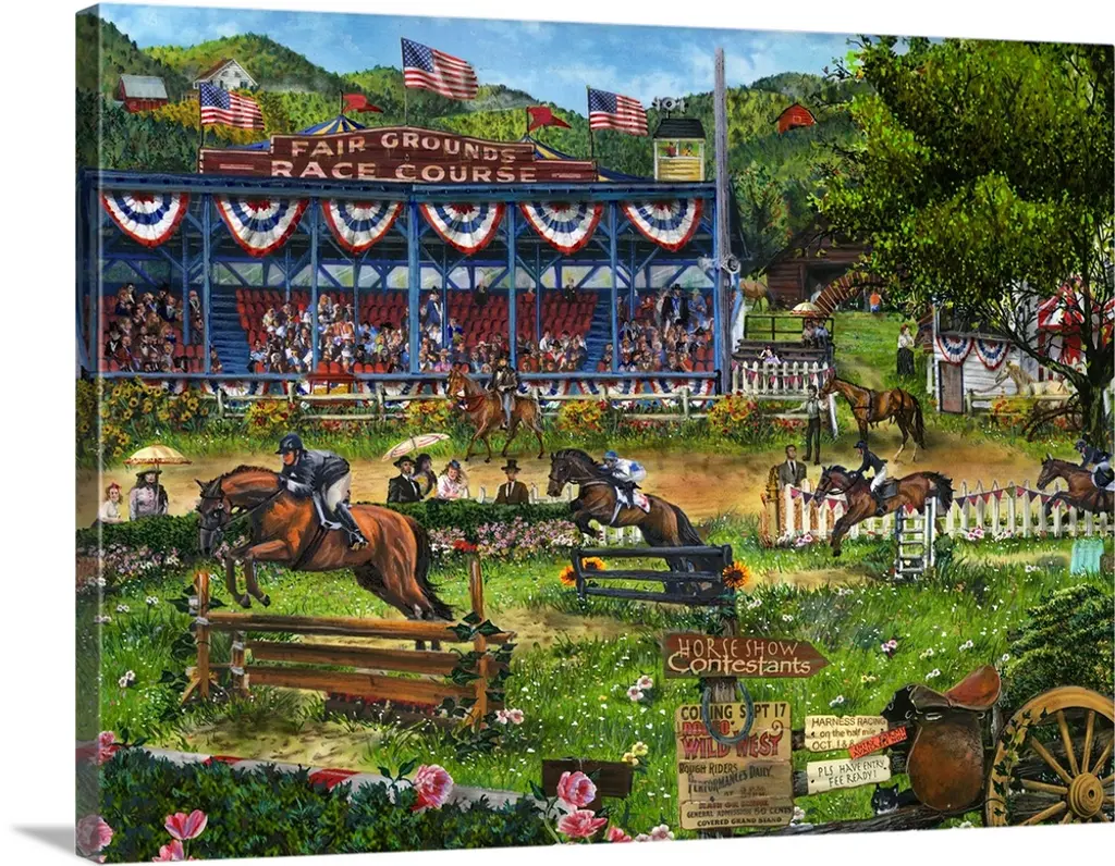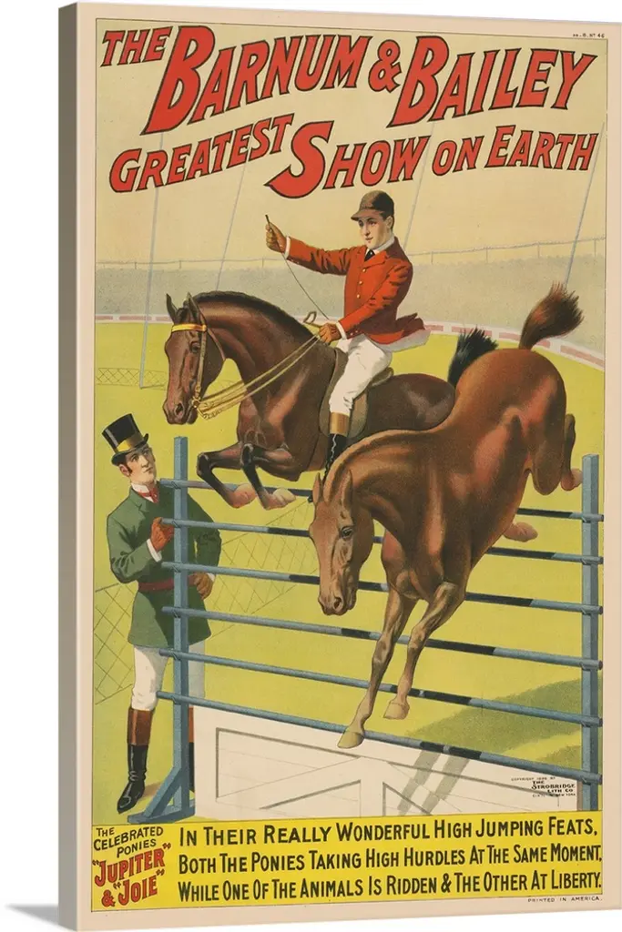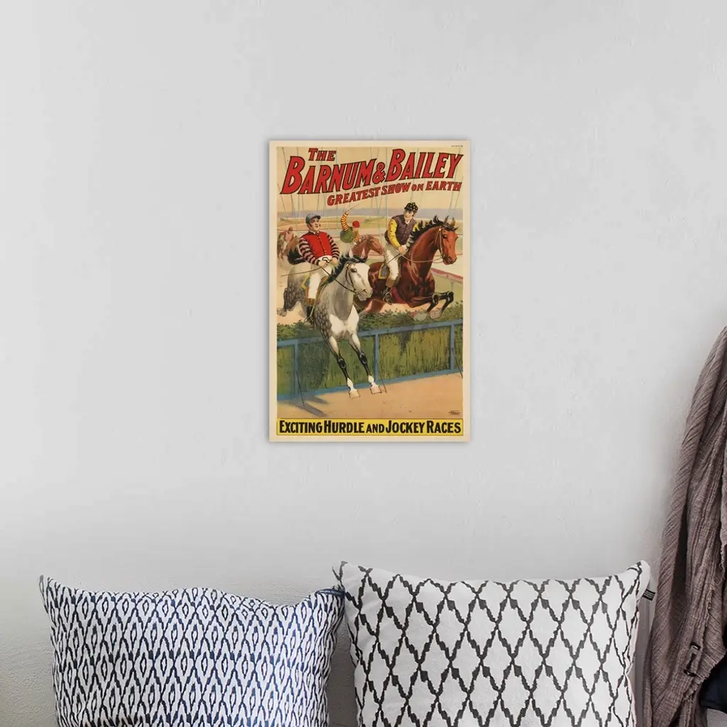 Vintage Barnum & Bailey Circus Poster Of Jockeys On Horses Jumping A Hedge, 1900 wall art for home and office decor. Discover canvas art prints, photos, mural, big canvas art and framed wall art in GreatBigCanvas.com's varied collections.
