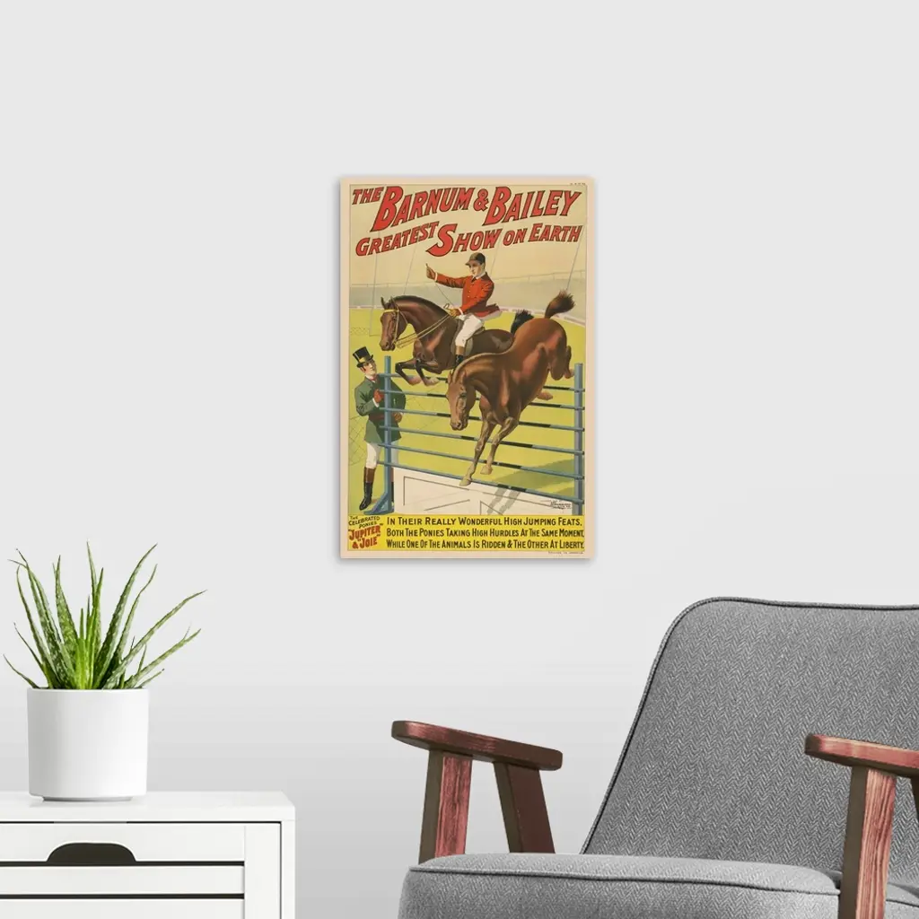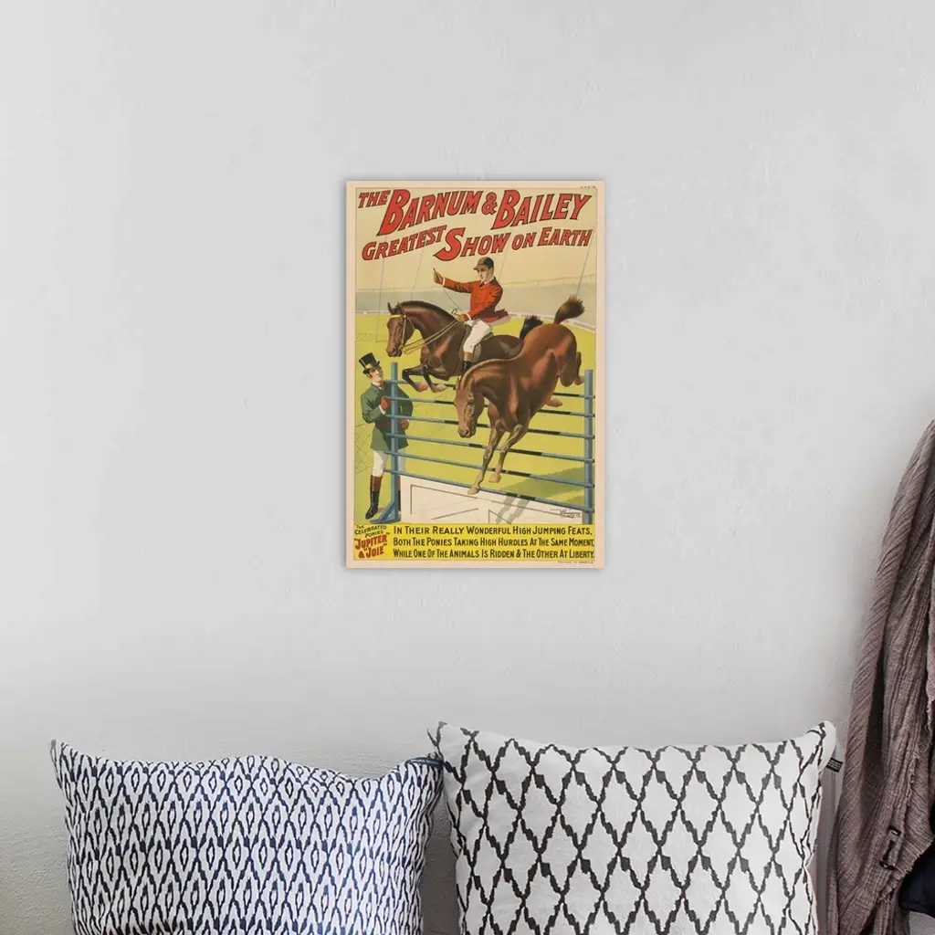 Vintage Barnum & Bailey Circus Poster Of Two Ponies Jumping Over An Obstacle, 1898 wall art for home and office decor. Discover canvas art prints, photos, mural, big canvas art and framed wall art in GreatBigCanvas.com's varied collections.